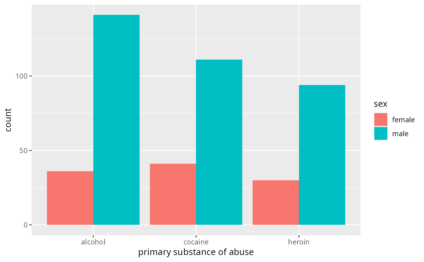 gf_bar(~substance, data = mosaicData::HELPrct, fill = ~sex)