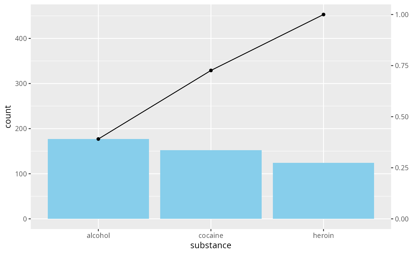 scale_y_continuous(sec.axis = sec_axis(~ . / nrow(HELPrct)))