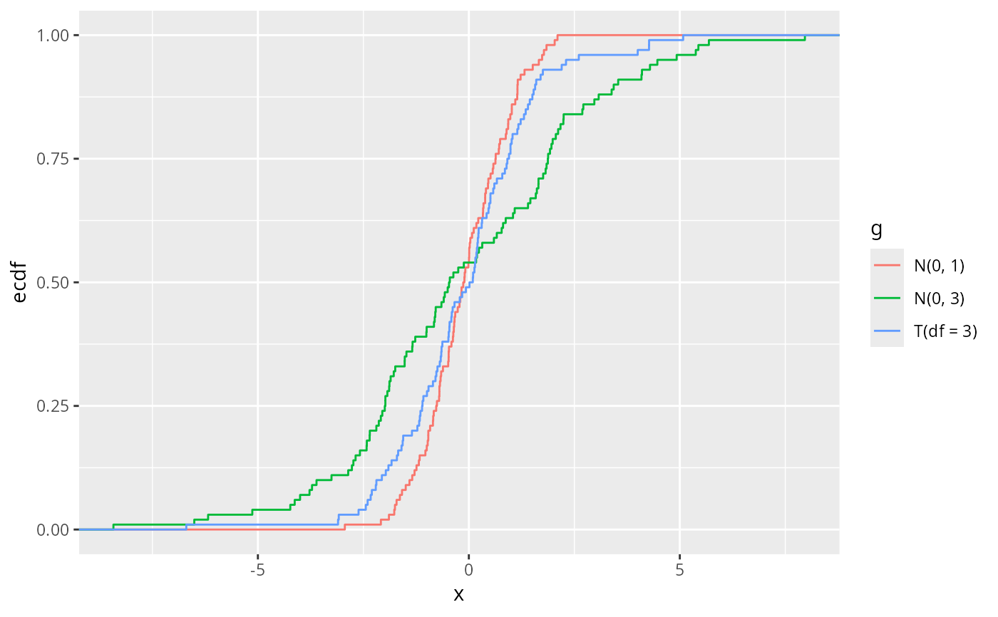 g = gl(3, 100, labels = c("N(0, 1)", "N(0, 3)", "T(df = 3)") )