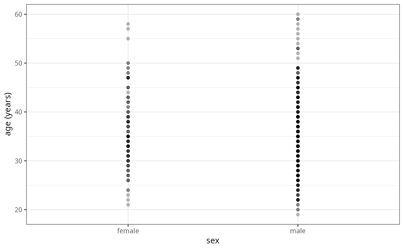 gf_jitter(age ~ sex, alpha = 0.25, data = mosaicData::HELPrct, width = 0.2, height = 0)