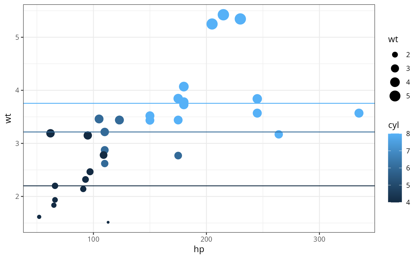 gf_abline(slope = ~0, intercept = ~median_wt, color = ~cyl, data = mtcars2)