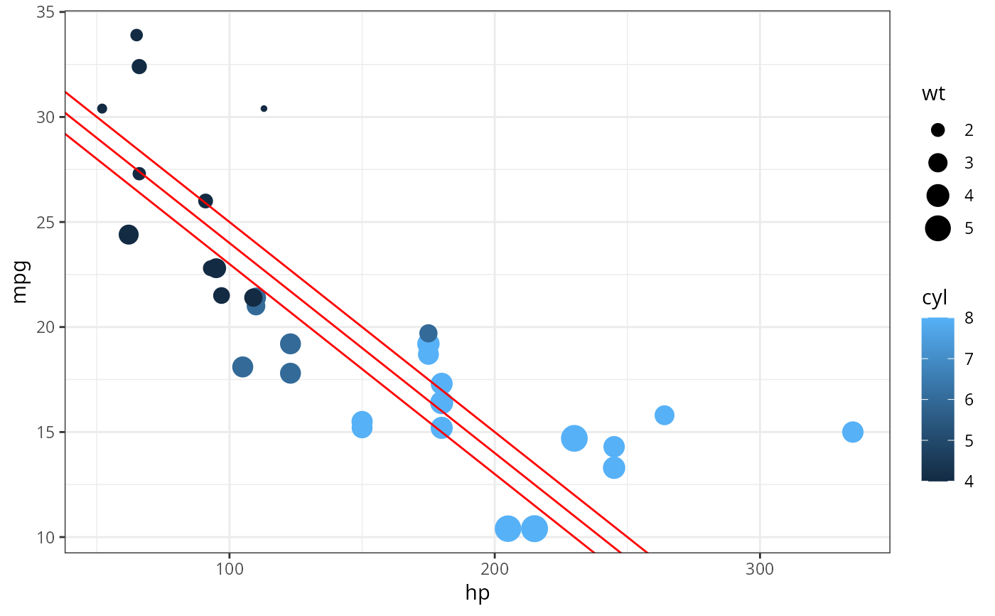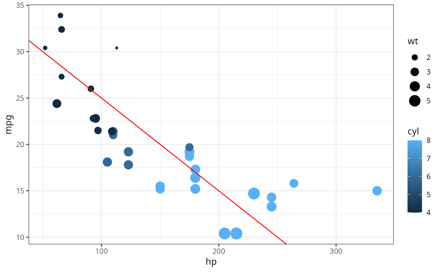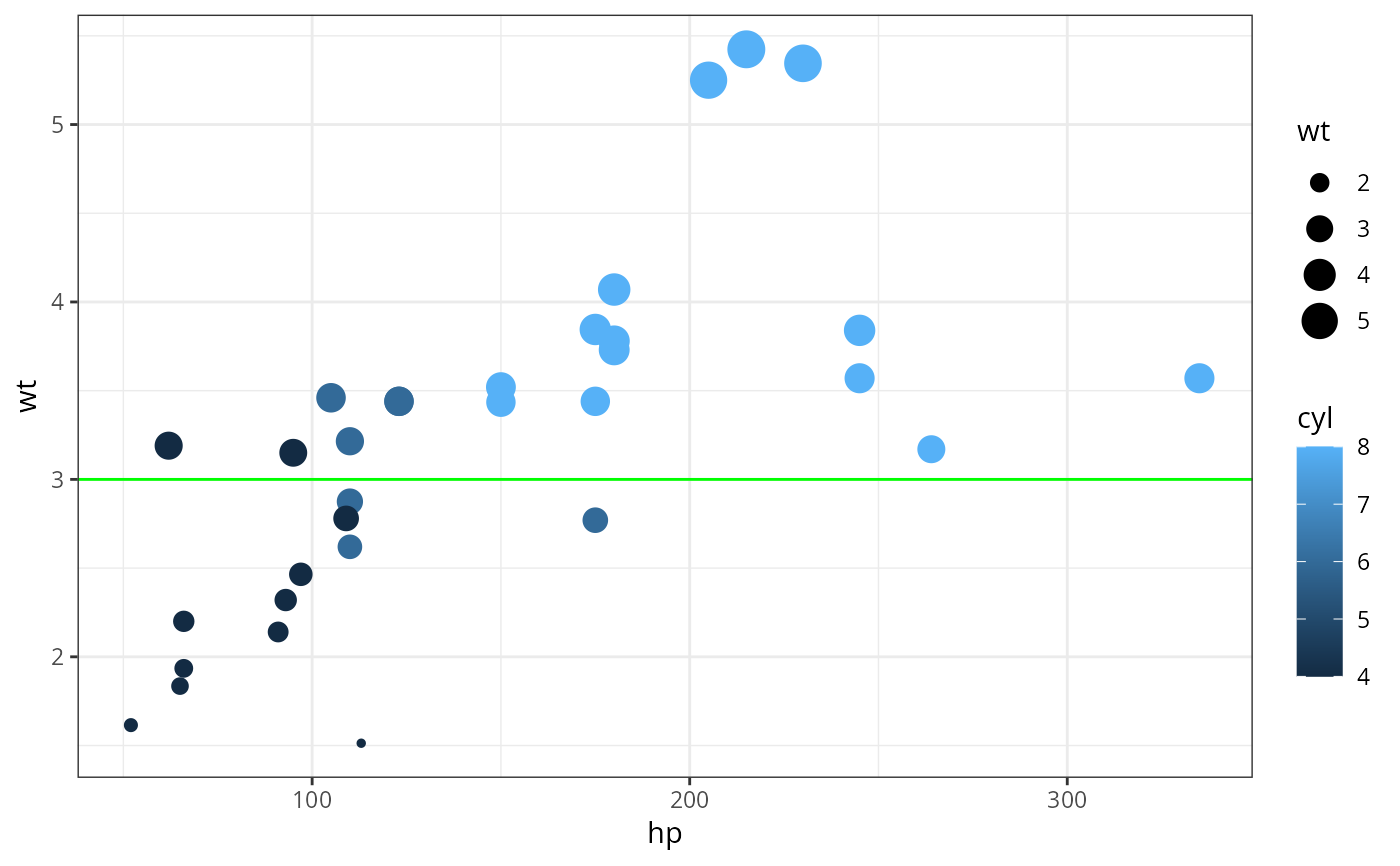 gf_point(mpg ~ hp, size = ~wt, data = mtcars, alpha = 0.3) |>