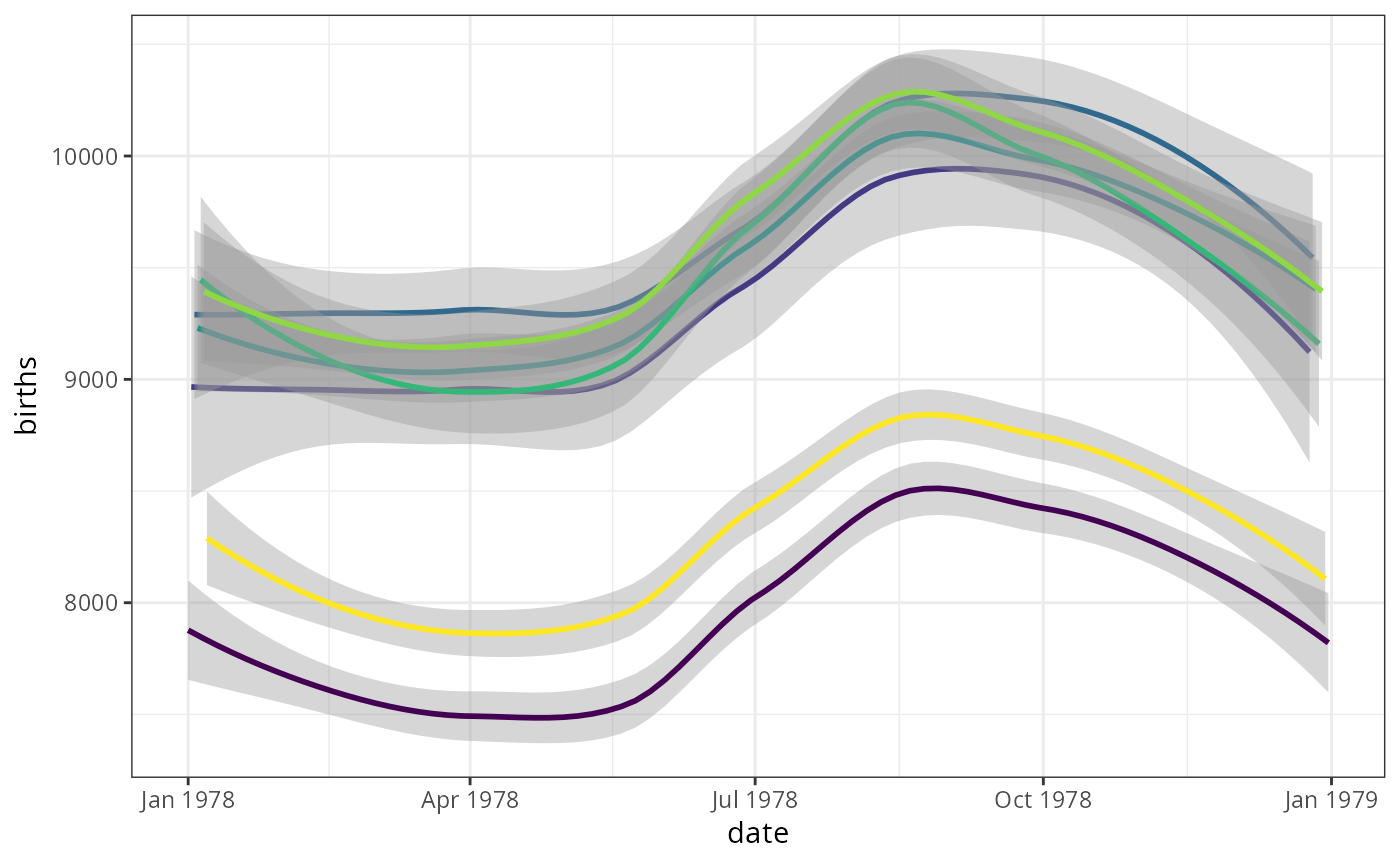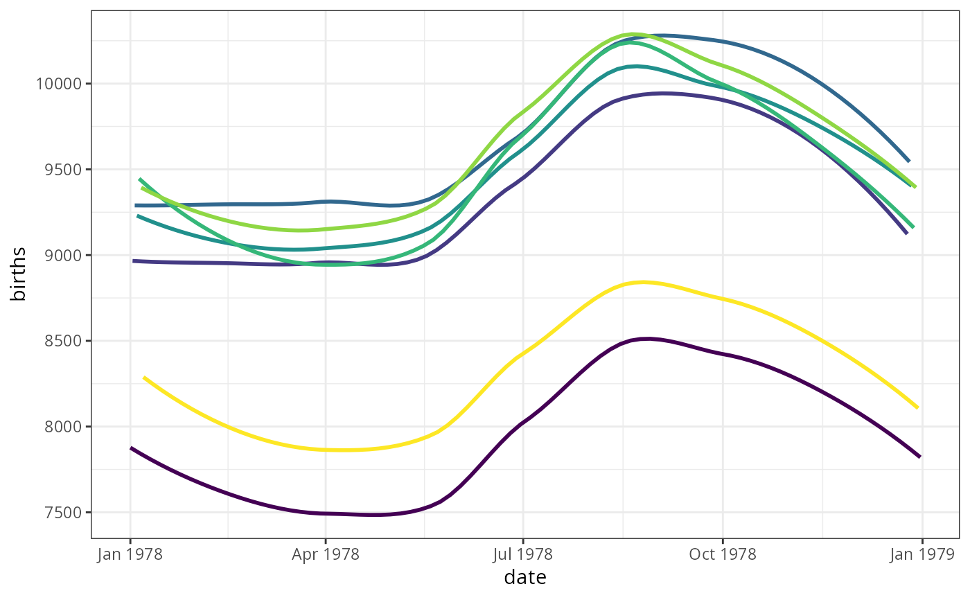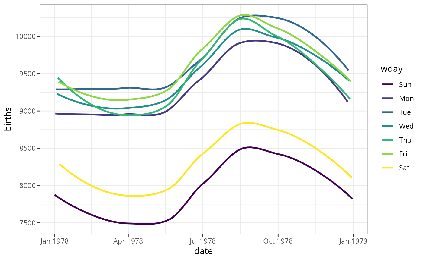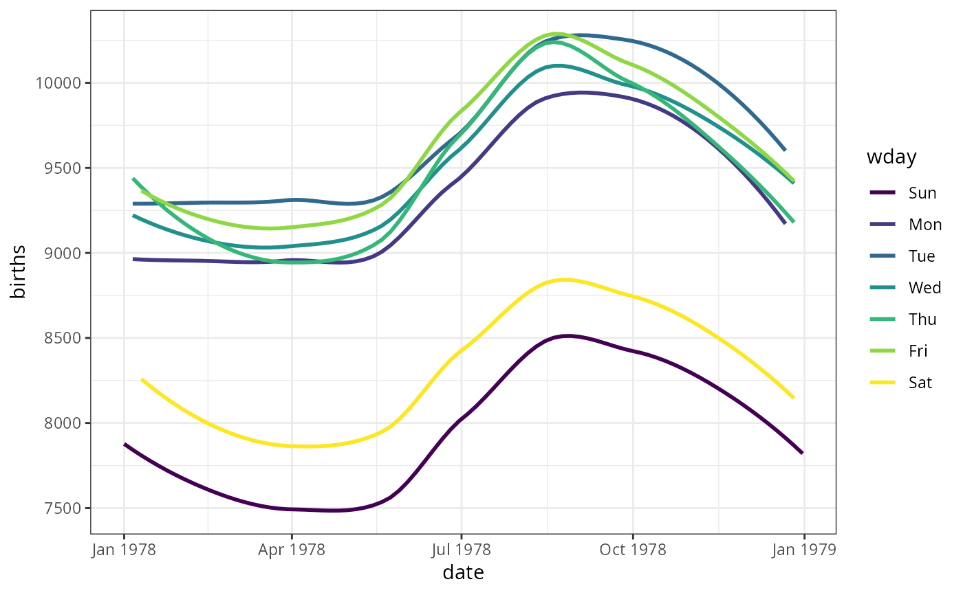 gf_smooth(births ~ date, color = ~wday, data = mosaicData::Births78)
