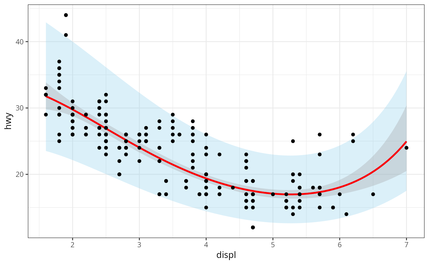 y ~ x,y ~ poly(x, 2),y ~ log(x).NULLby default, in which casemethod = NULLimpliesformula = y ~ xwhen there are fewer than 1,000 observations andformula = y ~ s(x, bs = "cs")otherwise.- se