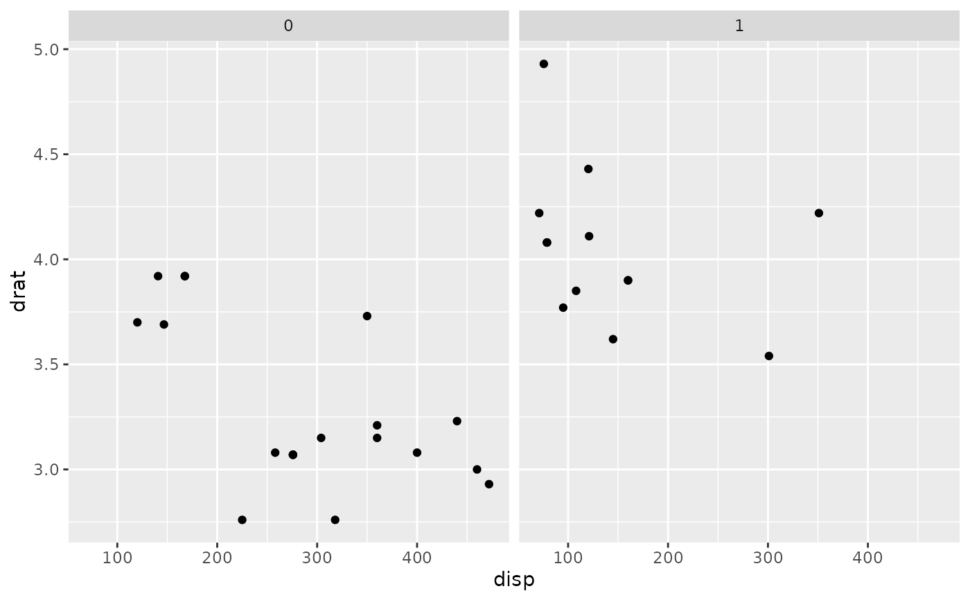 p <- ggplot(mtcars, aes(disp, drat)) + geom_point()