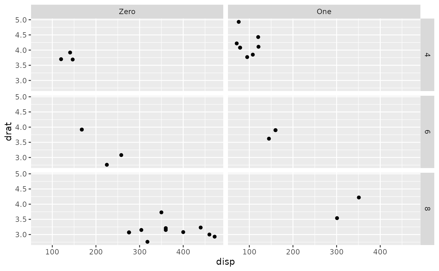 p + facet_grid(cyl ~ am, labeller = labeller(am = to_string))