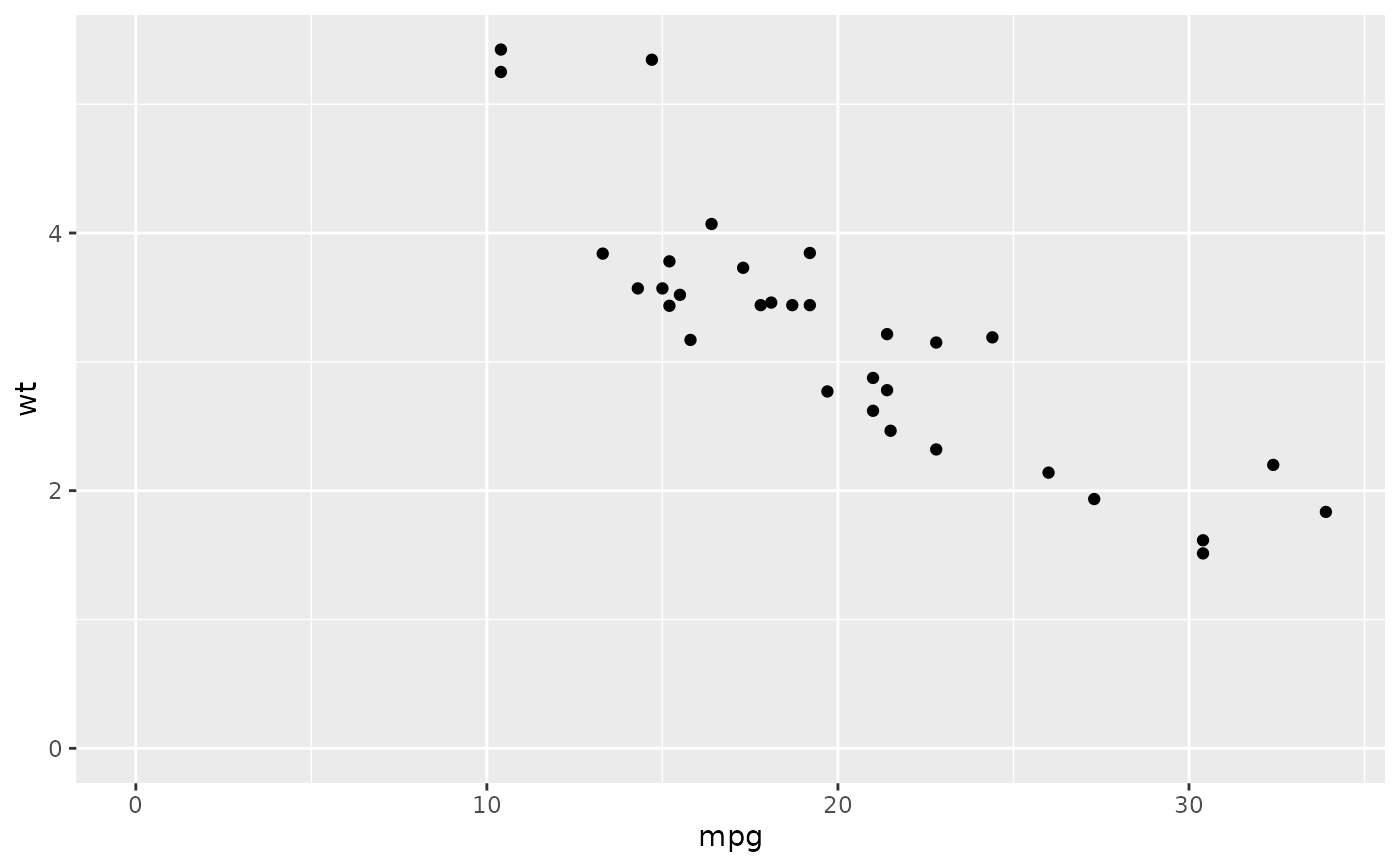 expand_limits(...)p <- ggplot(mtcars, aes(mpg, wt)) + geom_point()