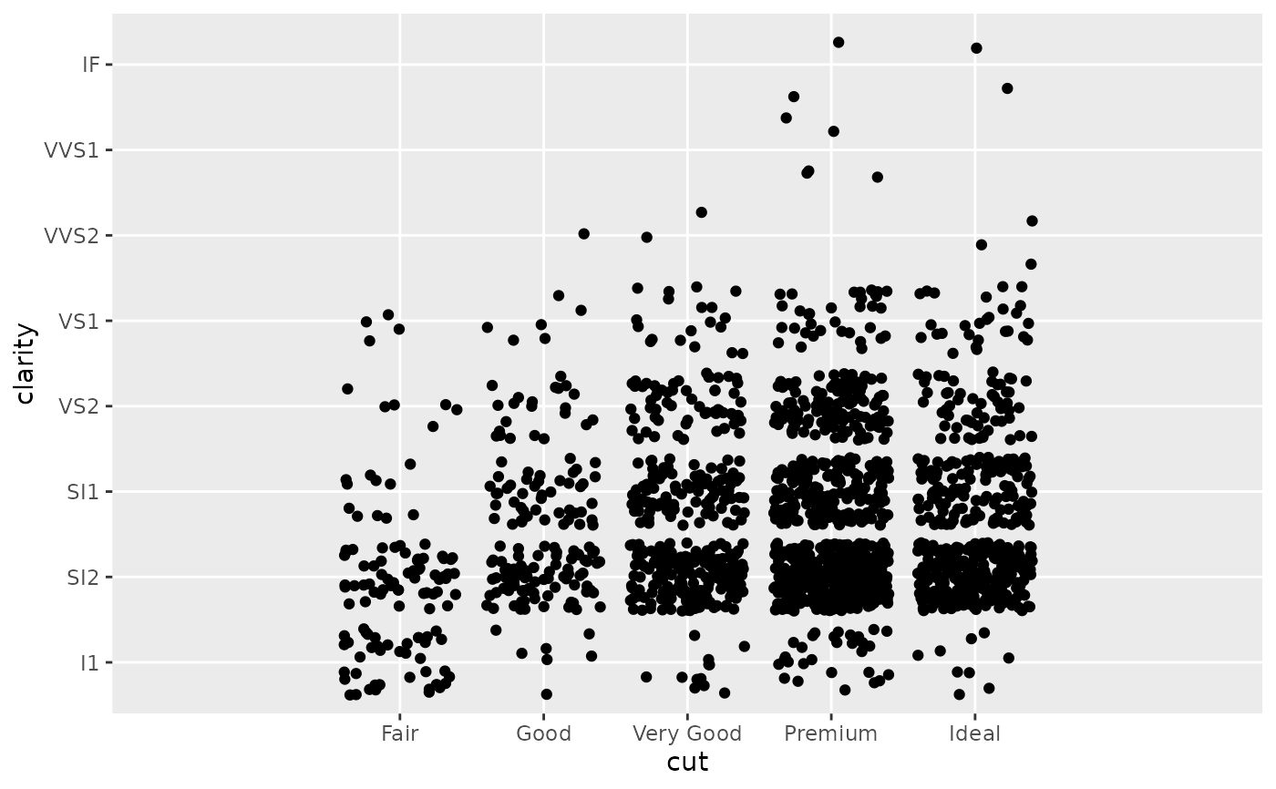 ggplot(subset(diamonds, carat > 2), aes(cut, clarity)) +