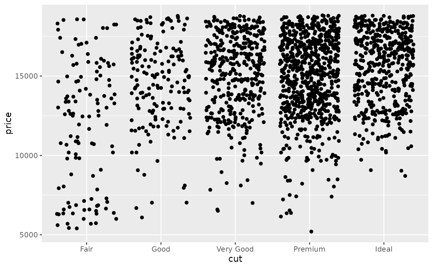 ggplot(subset(diamonds, carat > 2), aes(cut, price)) +