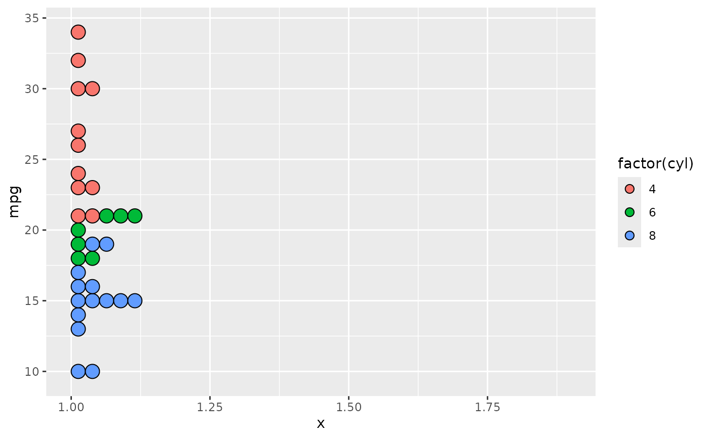 geom_dotplot(binaxis = "y", stackgroups = TRUE, binwidth = 1, method = "histodot")