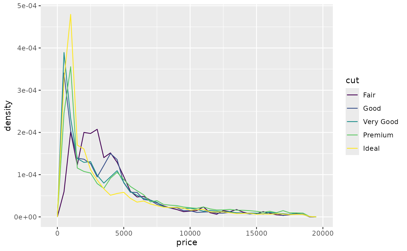 ggplot(diamonds, aes(price, after_stat(density), colour = cut)) +