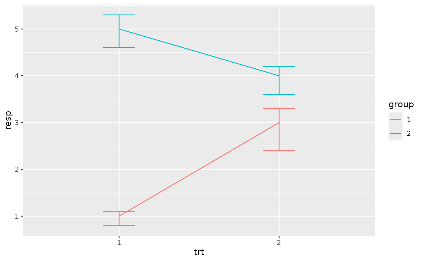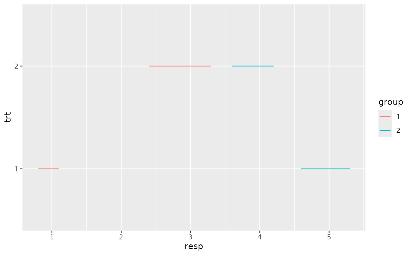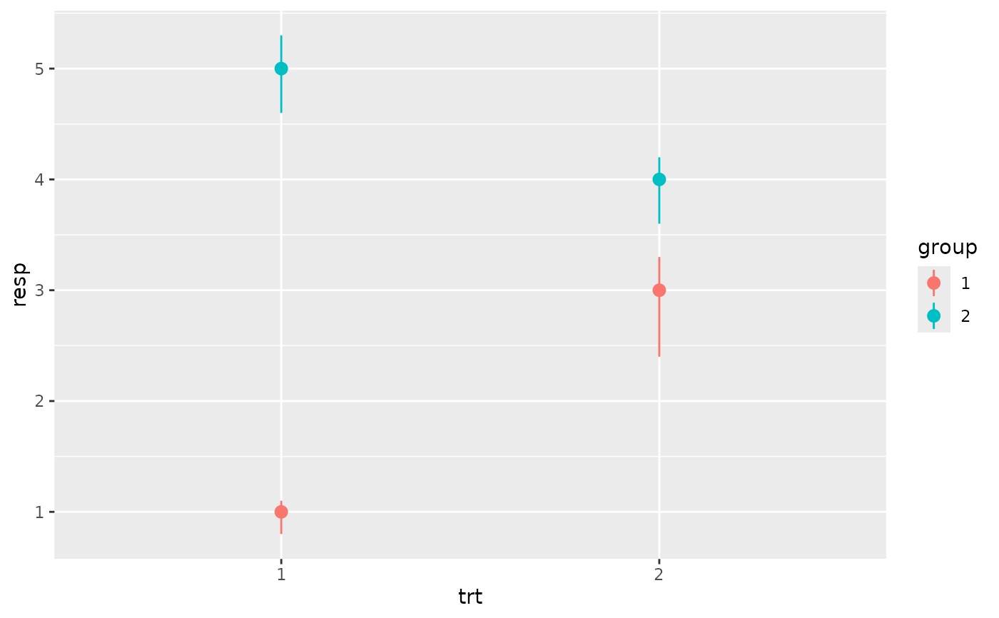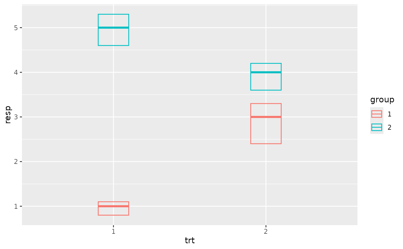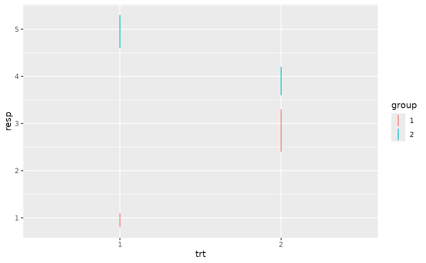 p <- ggplot(df, aes(trt, resp, colour = group))