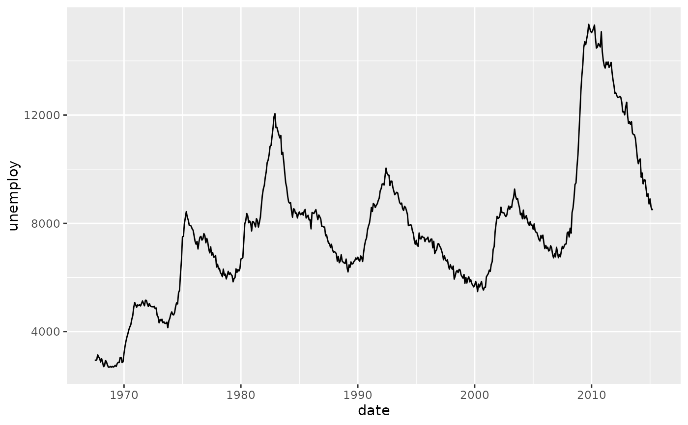 ggplot(economics, aes(date, unemploy)) + geom_line()