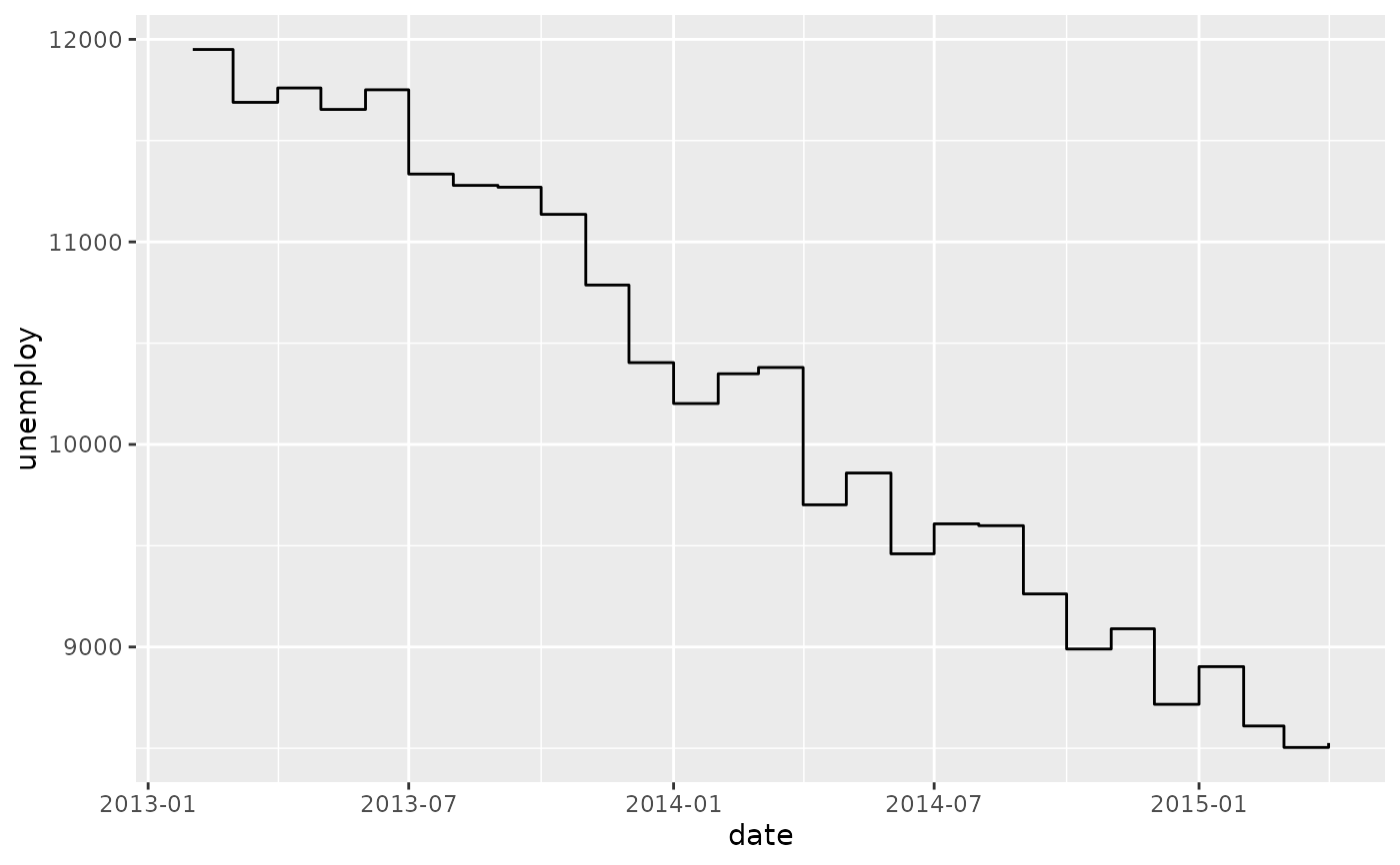 ggplot(recent, aes(date, unemploy)) + geom_step()
