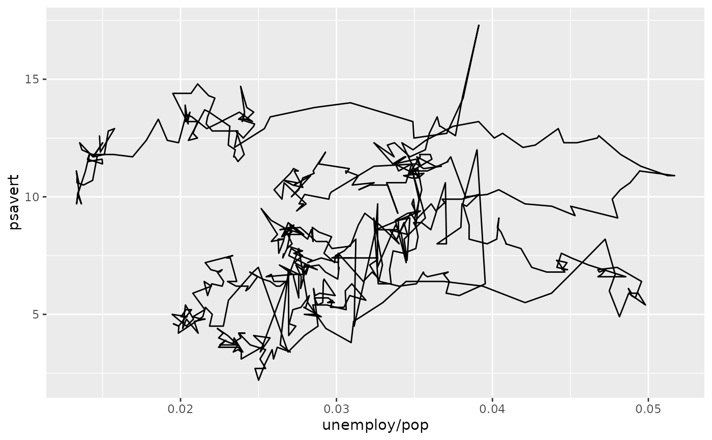 m <- ggplot(economics, aes(unemploy/pop, psavert))