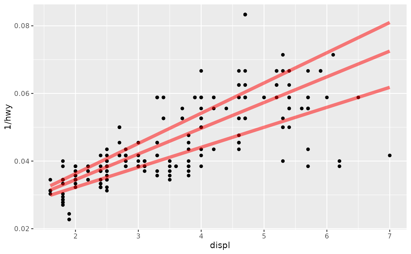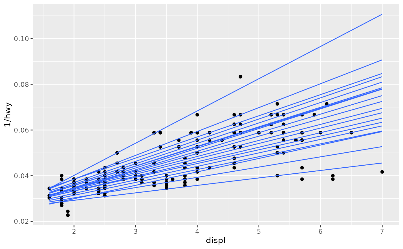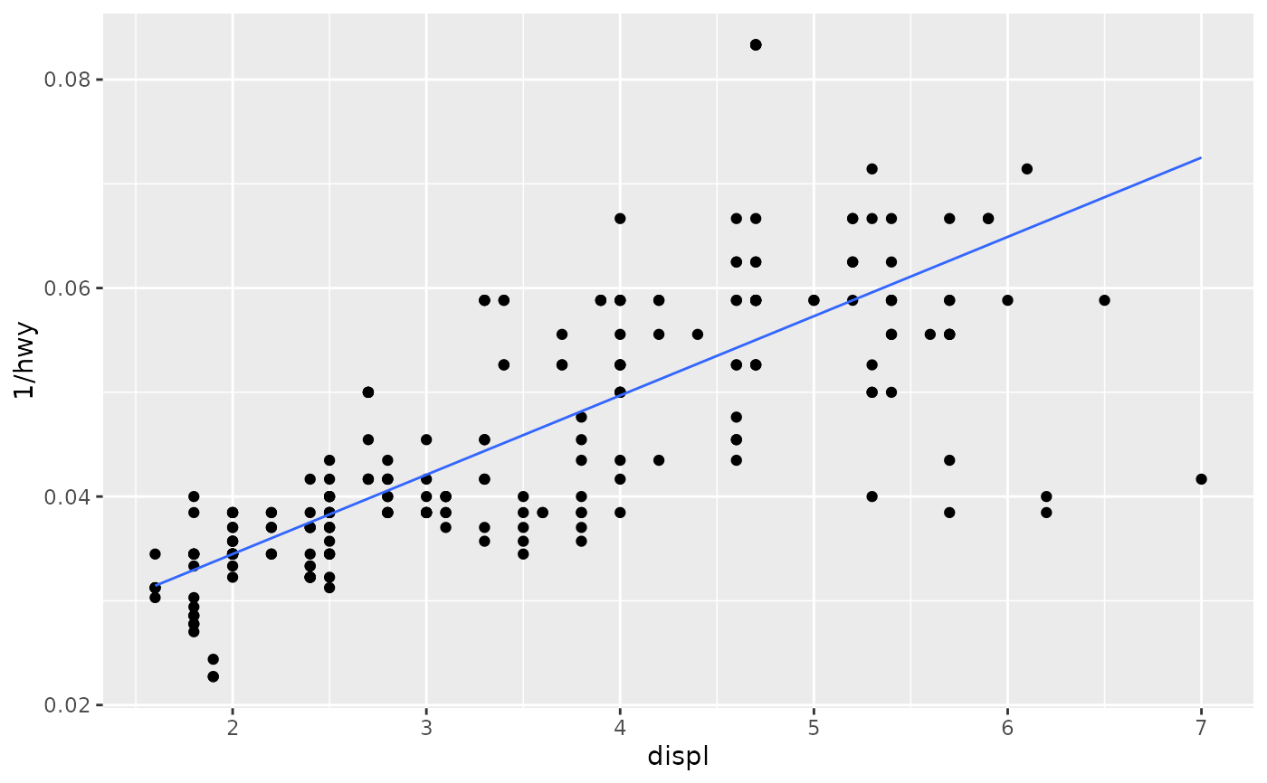 ggplot(mpg, aes(displ, 1 / hwy)) +