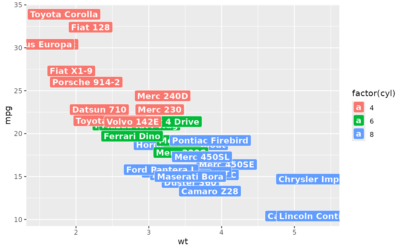 p + geom_label(aes(fill = factor(cyl)), colour = "white", fontface = "bold")
