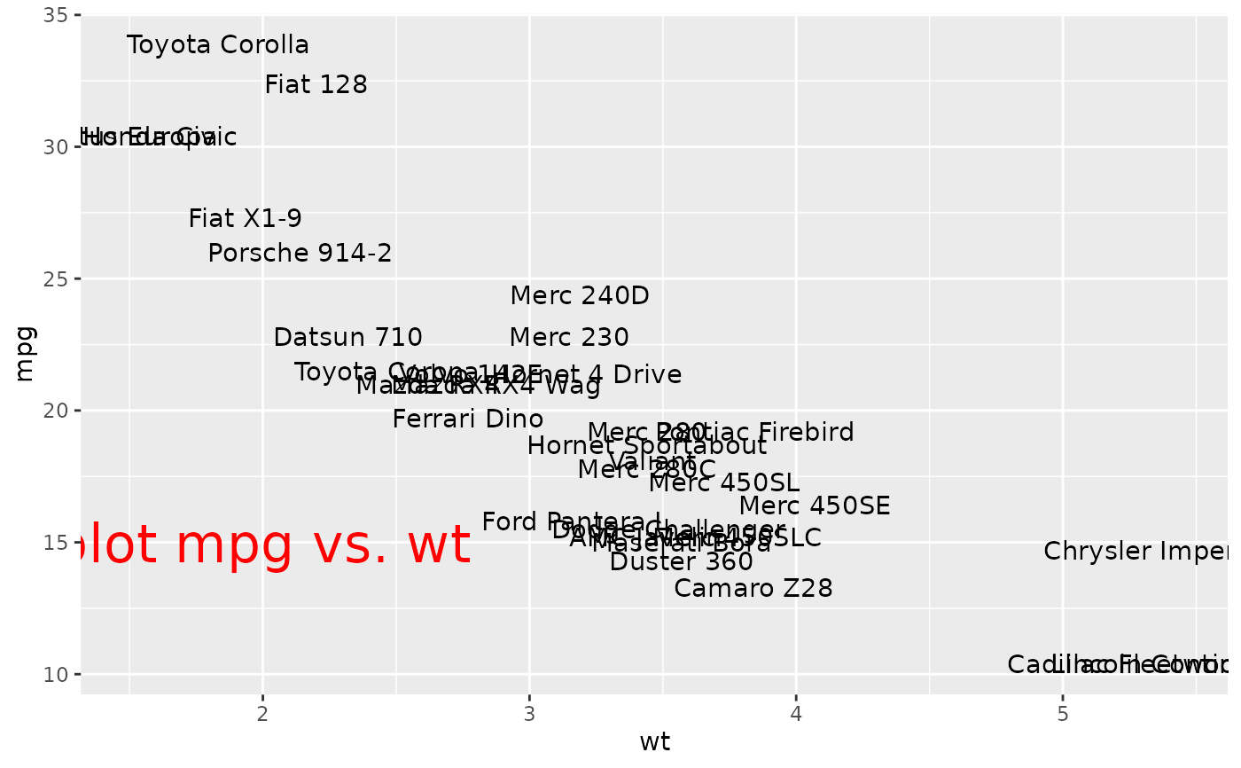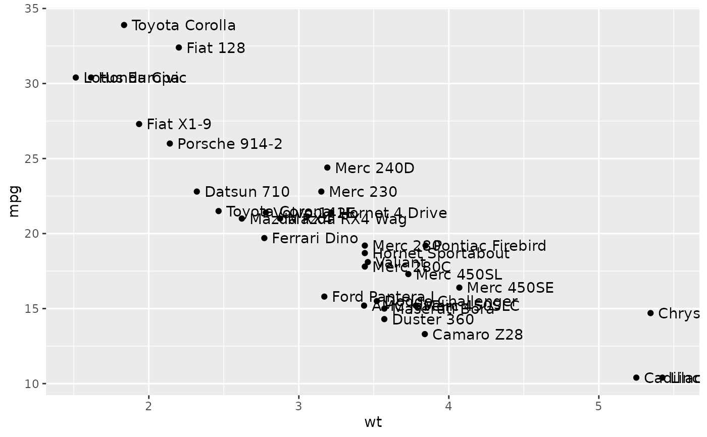 p <- ggplot(mtcars, aes(wt, mpg, label = rownames(mtcars)))