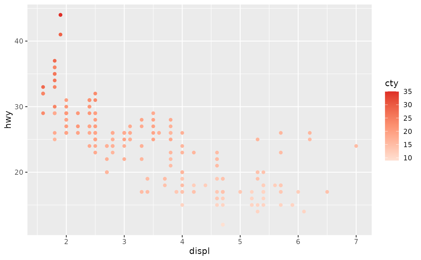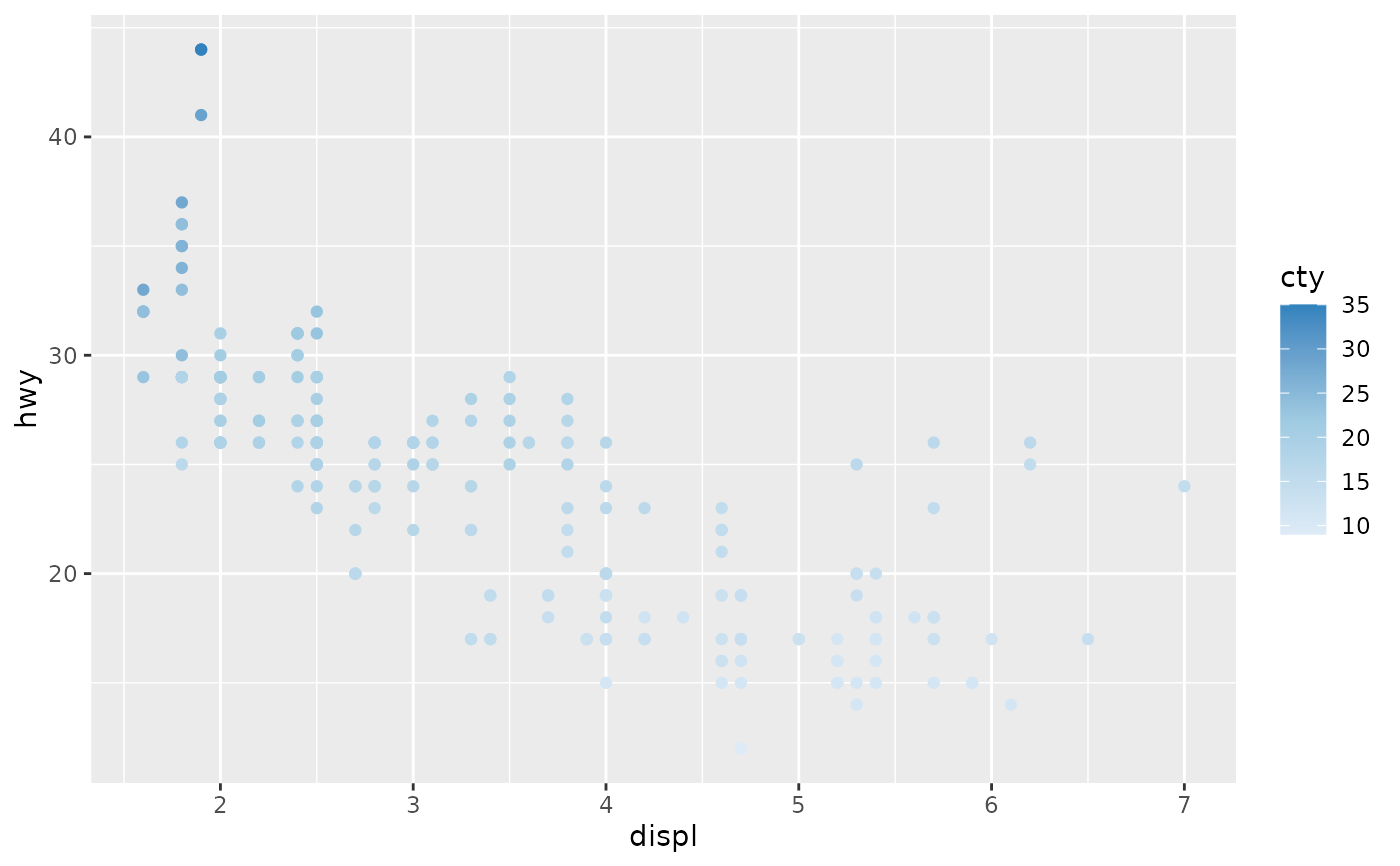 p <- ggplot(mpg, aes(displ, hwy, colour = cty)) +