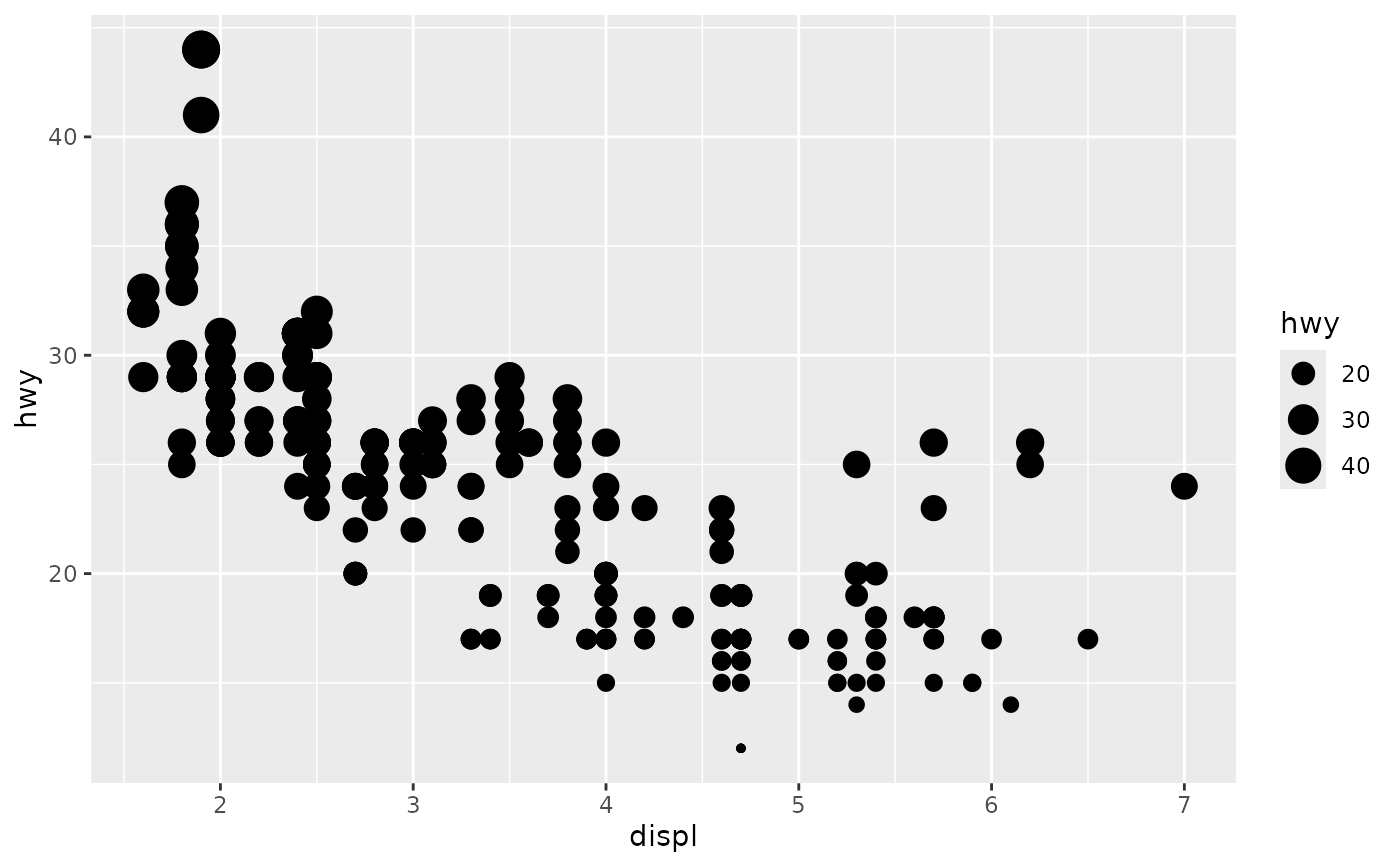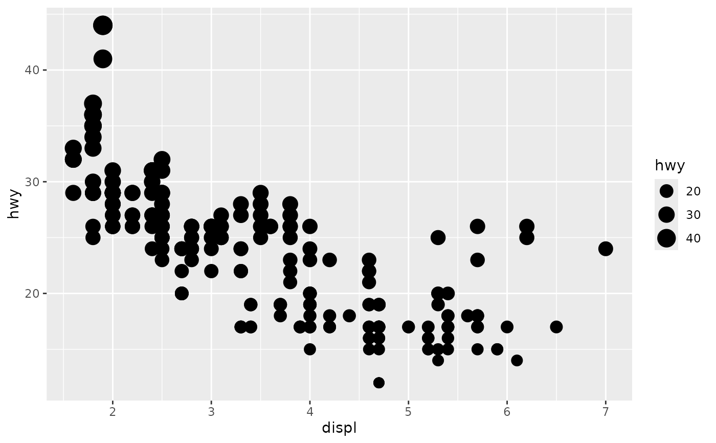 p <- ggplot(mpg, aes(displ, hwy, size = hwy)) +