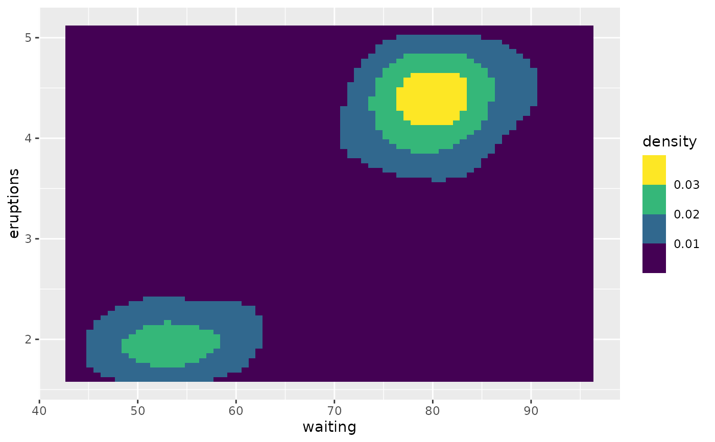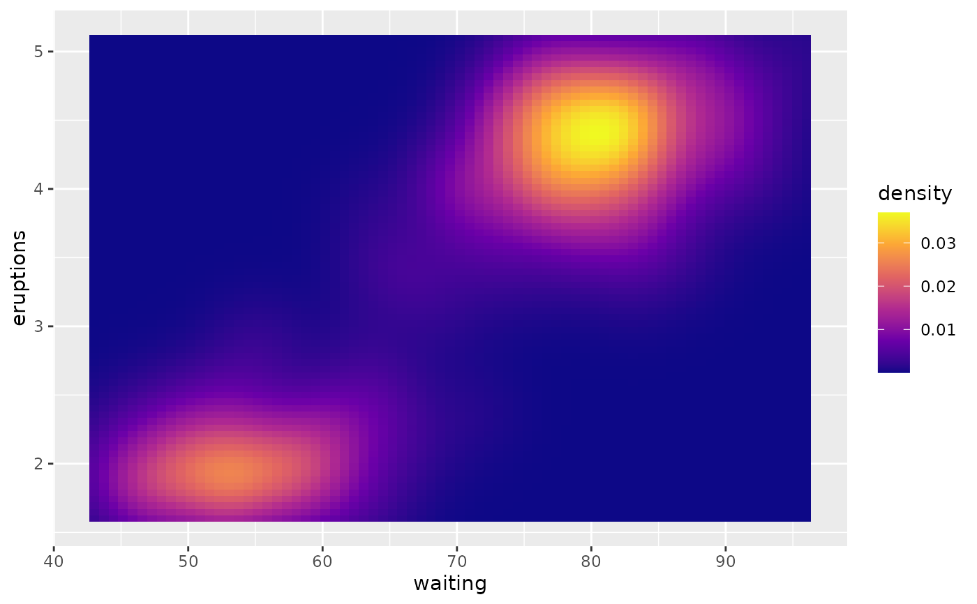 geom_tile(aes(waiting, eruptions, fill = density)))