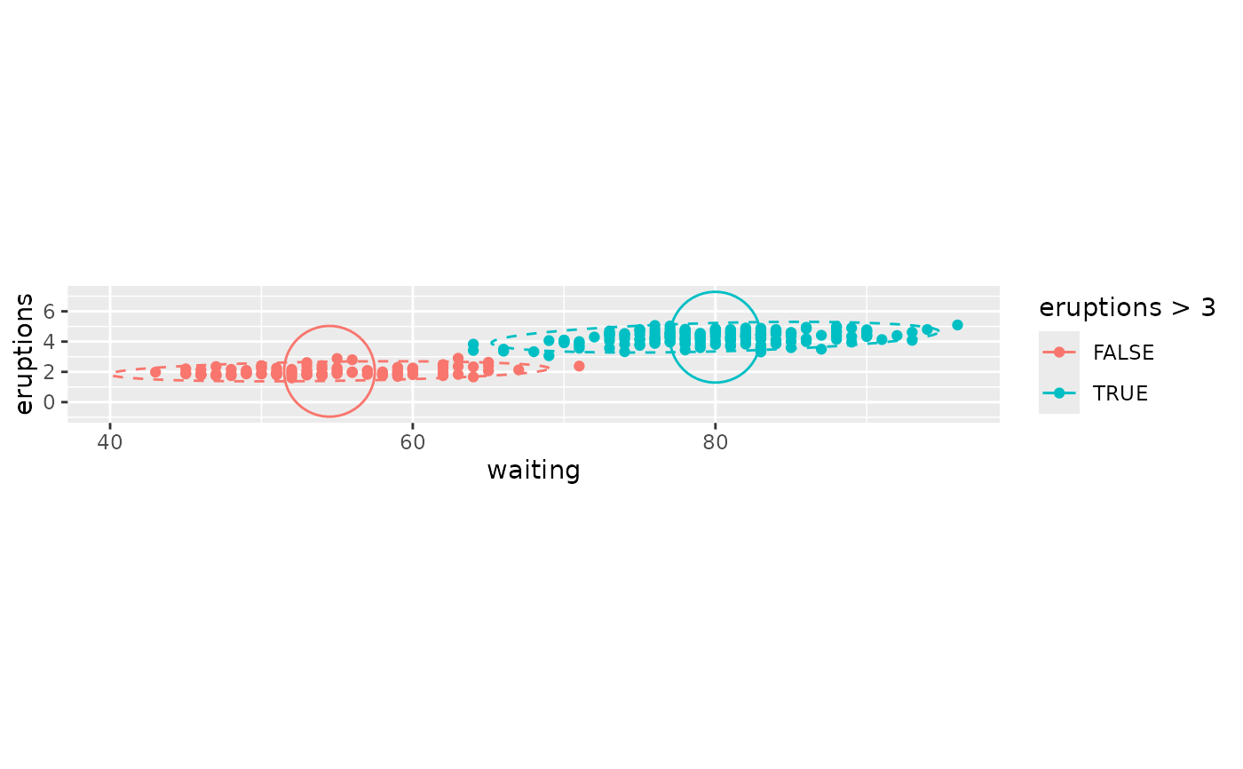 ggplot(faithful, aes(waiting, eruptions, fill = eruptions > 3)) +