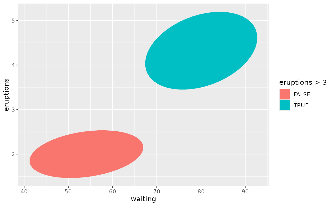 stat_ellipse() understands the following aesthetics. Required aesthetics are displayed in bold and defaults are displayed for optional aesthetics: