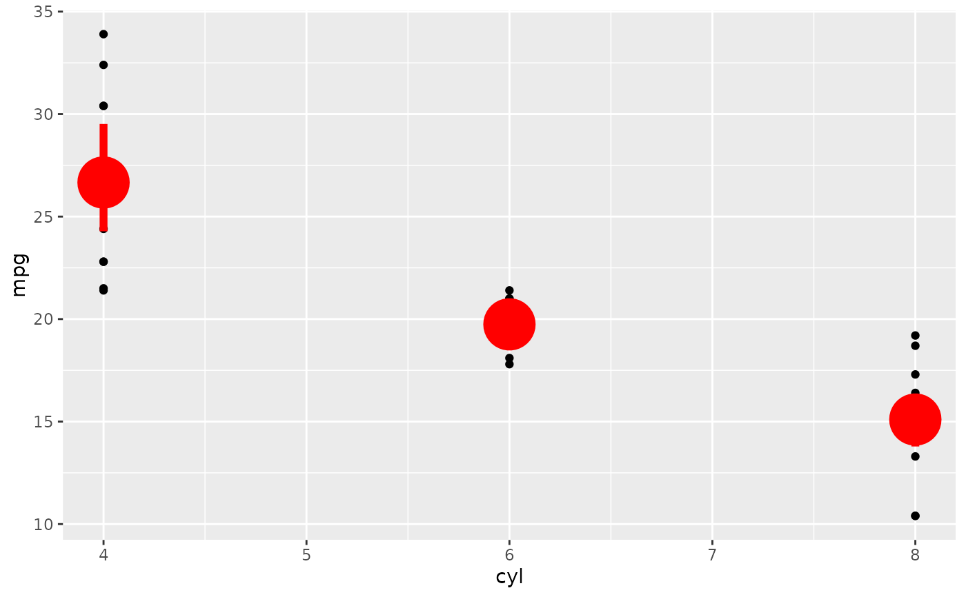 d + stat_summary(fun.data = "mean_cl_boot", colour = "red", linewidth = 2, size = 3)