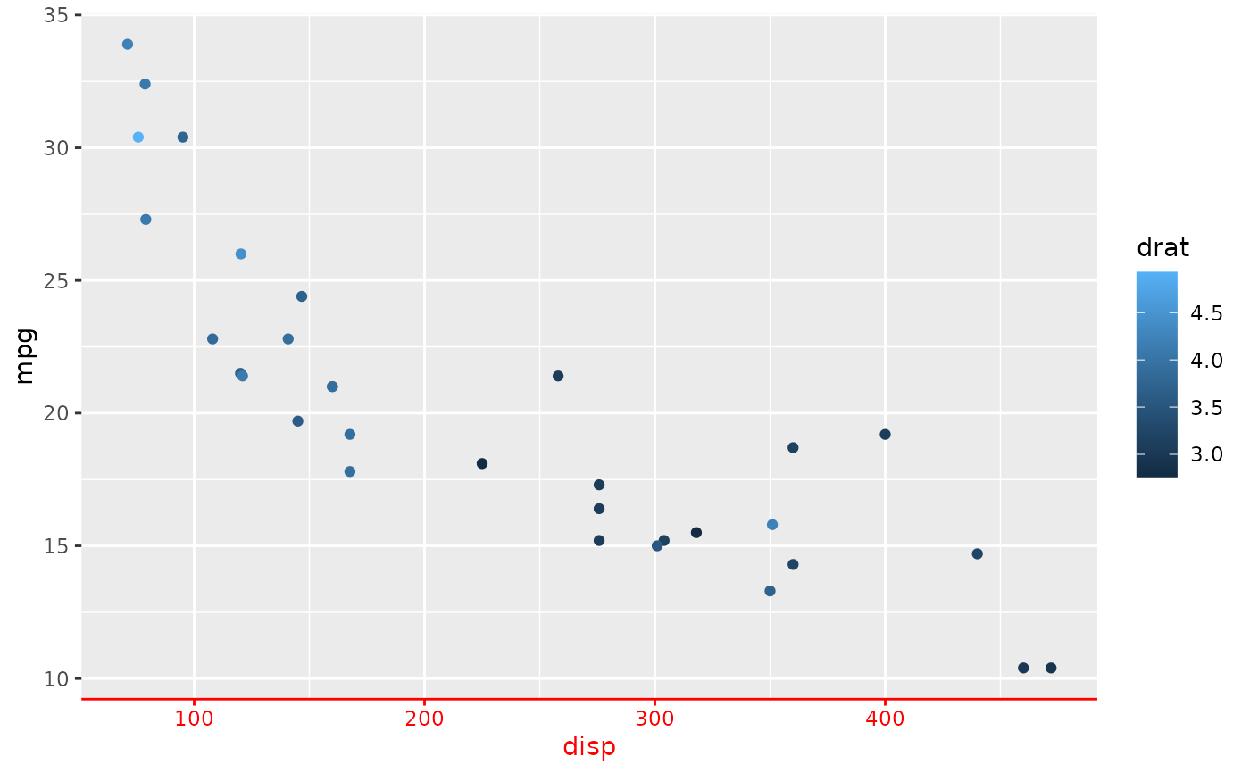 p <- ggplot(mtcars, aes(disp, mpg, colour = drat)) +