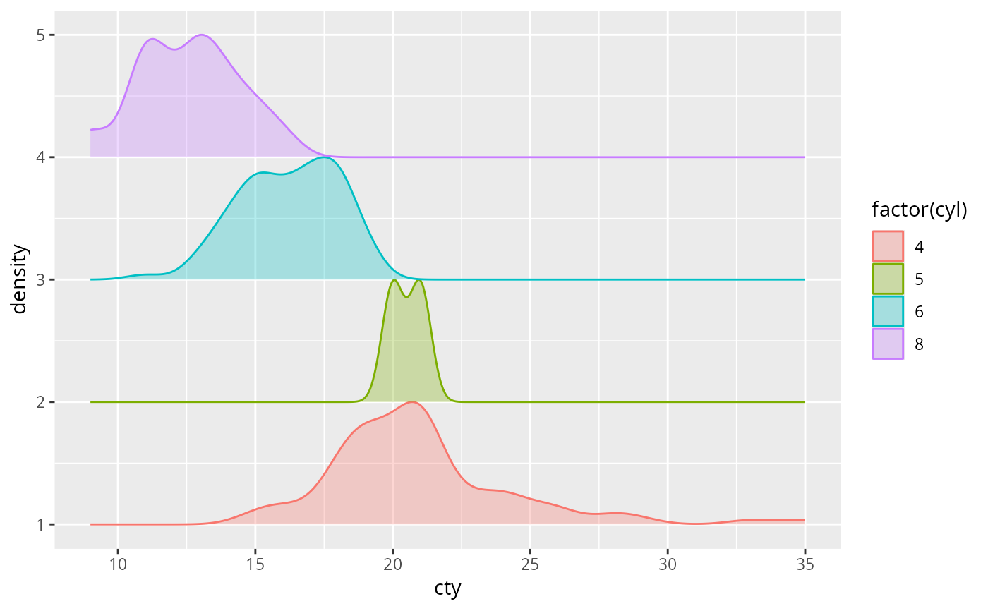 ggplot(mpg, aes(cty, colour = factor(cyl))) +