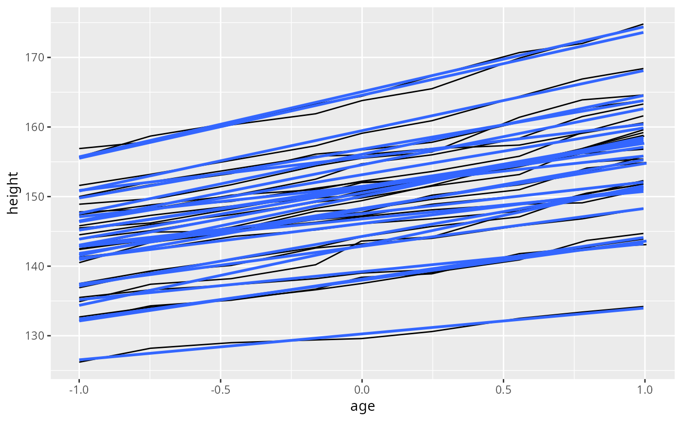 The examples below use a longitudinal dataset, Oxboys, from the nlme package to demonstrate