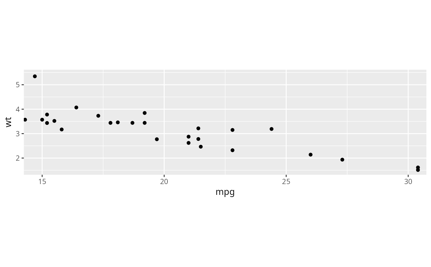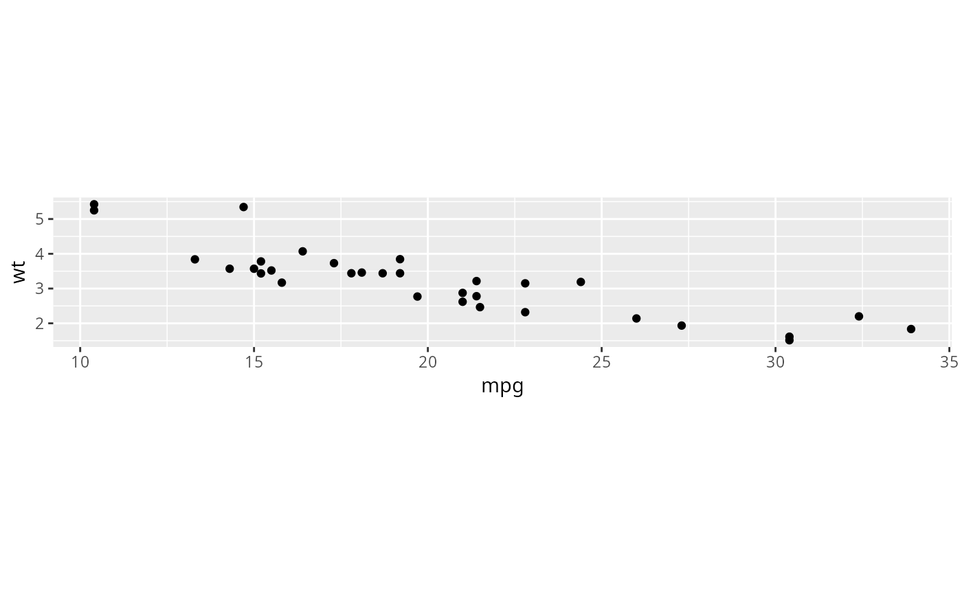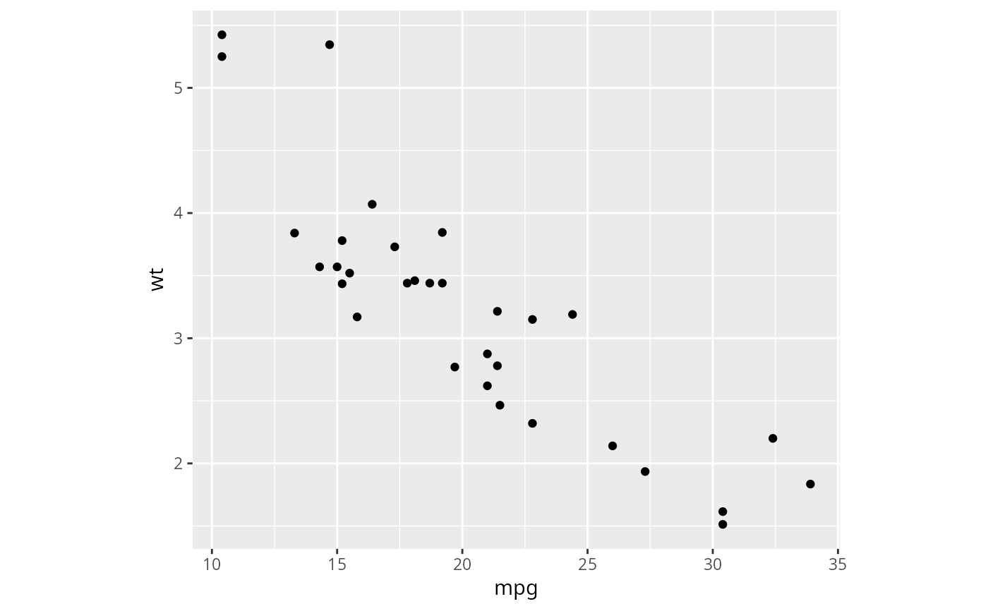 p <- ggplot(mtcars, aes(mpg, wt)) + geom_point()