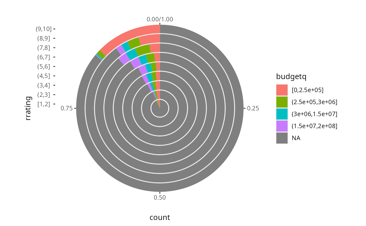 doh <- ggplot(movies, aes(x = rrating, fill = budgetq))