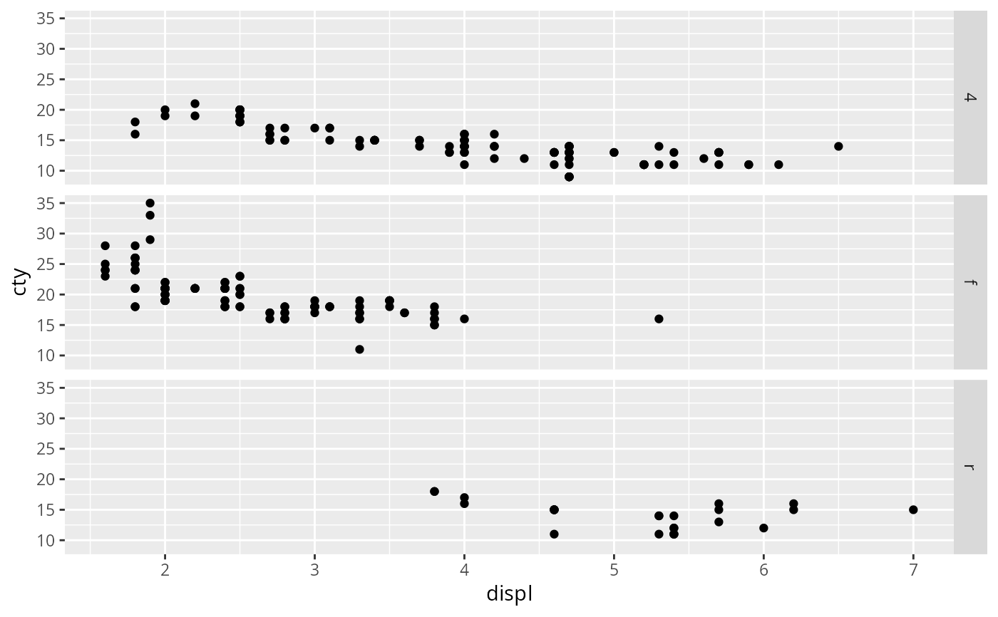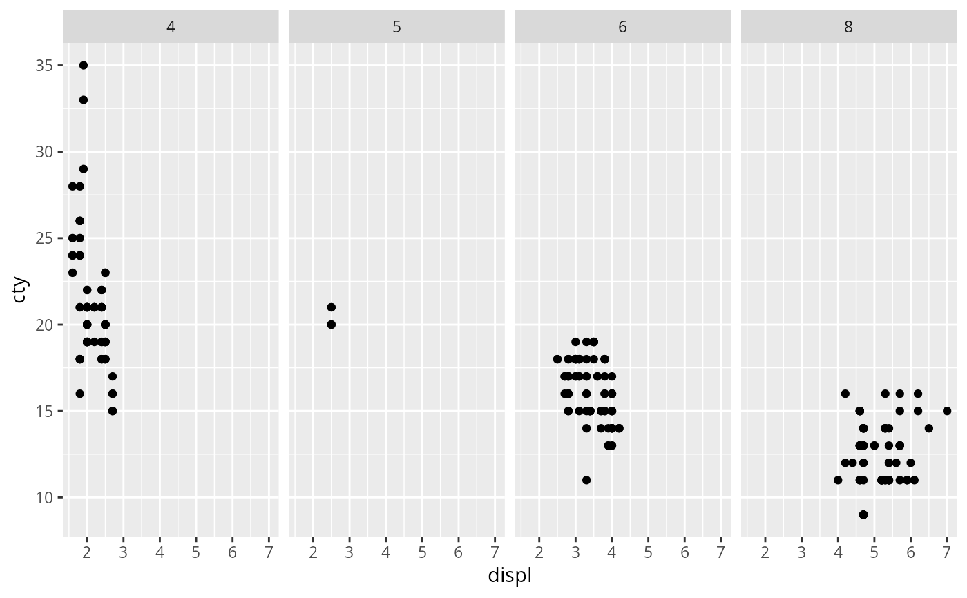 vars()and defining faceting groups on the rows or columns dimension. The variables can be named (the names are passed tolabeller).For compatibility with the classic interface,