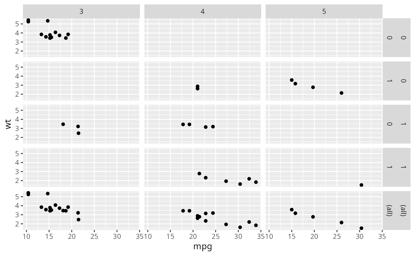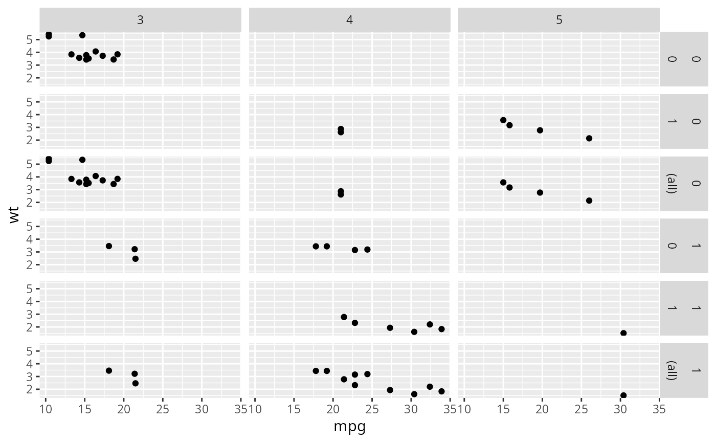 mg + facet_grid(vs + am ~ gear, margins = TRUE)