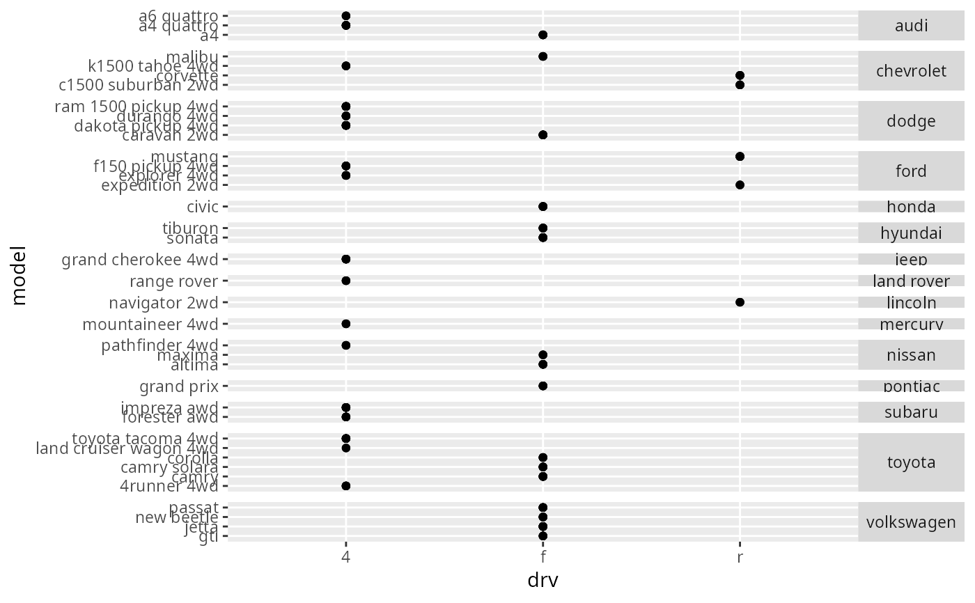 ggplot(mpg, aes(drv, model)) +
