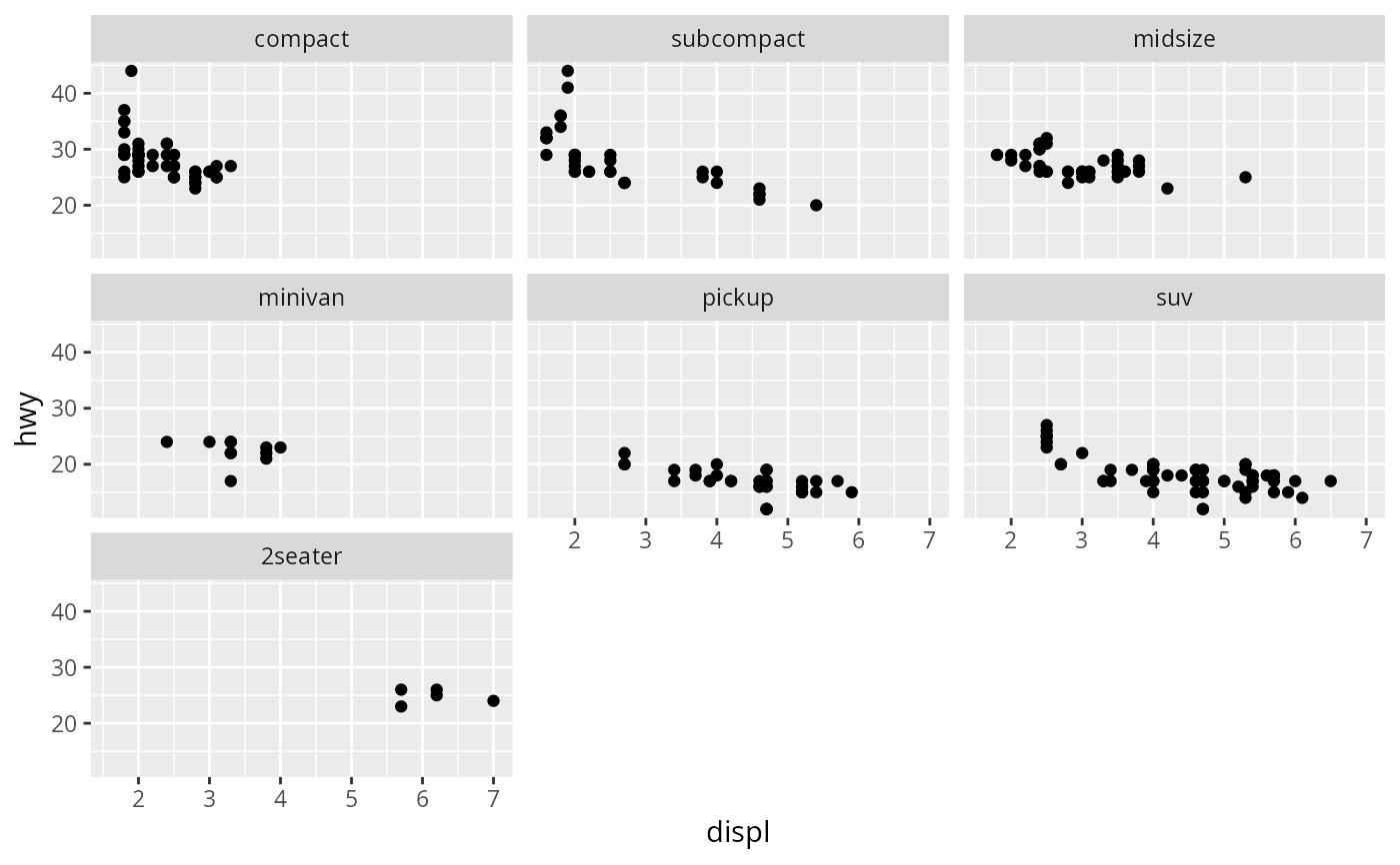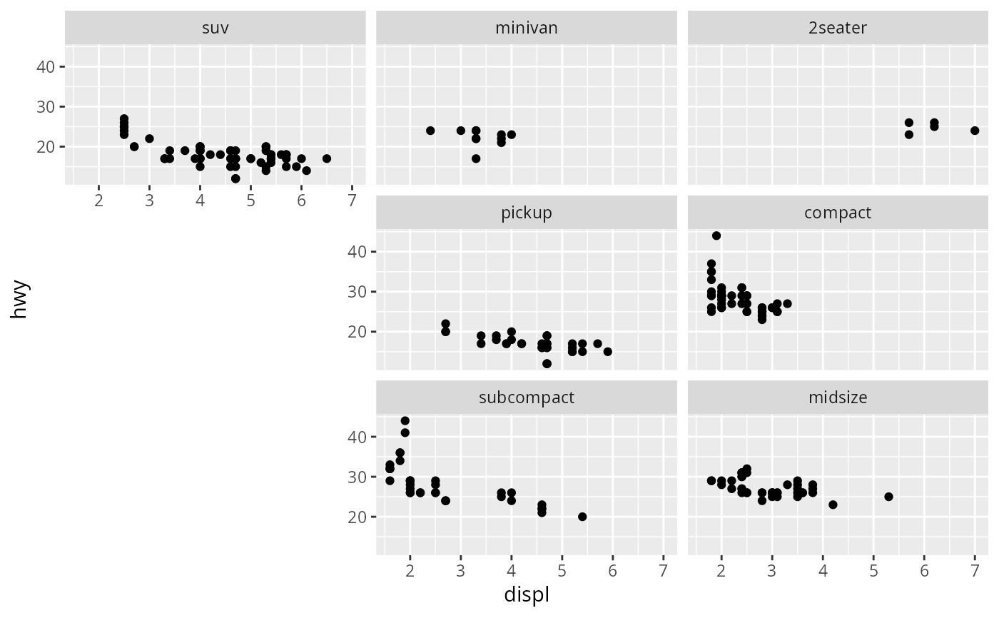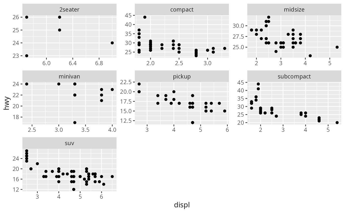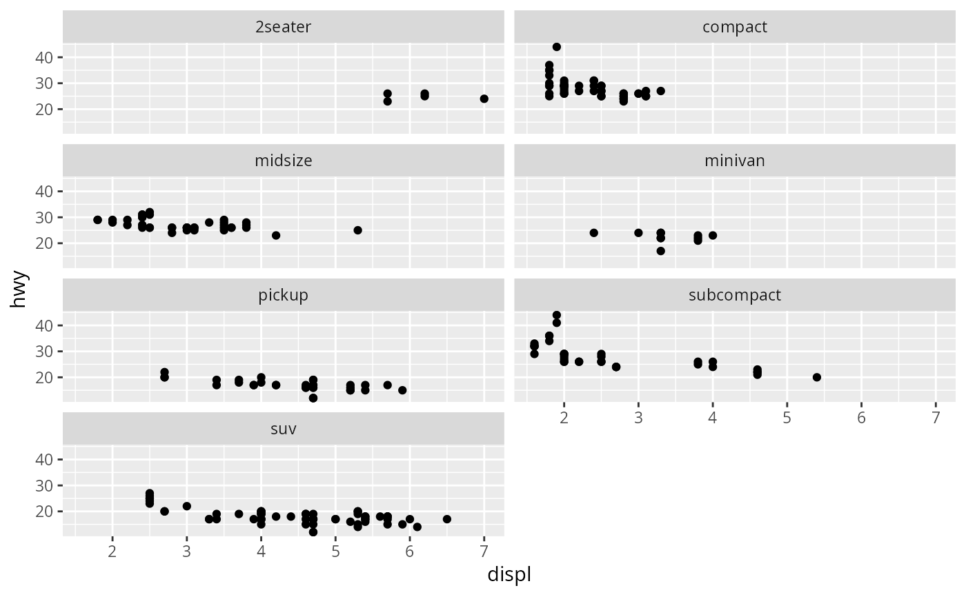 vars()and defining faceting groups on the rows or columns dimension. The variables can be named (the names are passed tolabeller).For compatibility with the classic interface, can also be a formula or character vector. Use either a one sided formula,