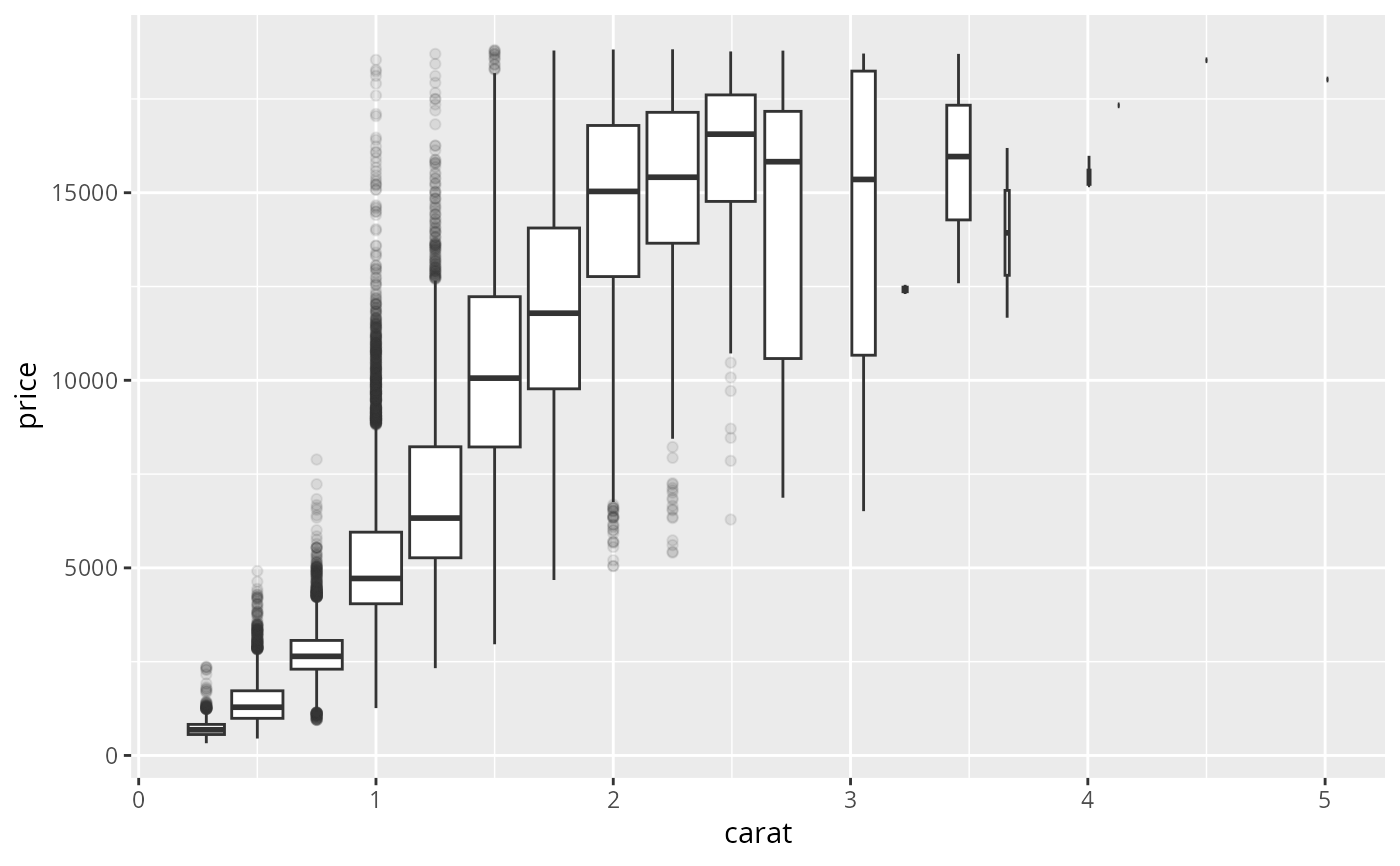 geom_boxplot(aes(group = cut_width(carat, 0.25)), outlier.alpha = 0.1)