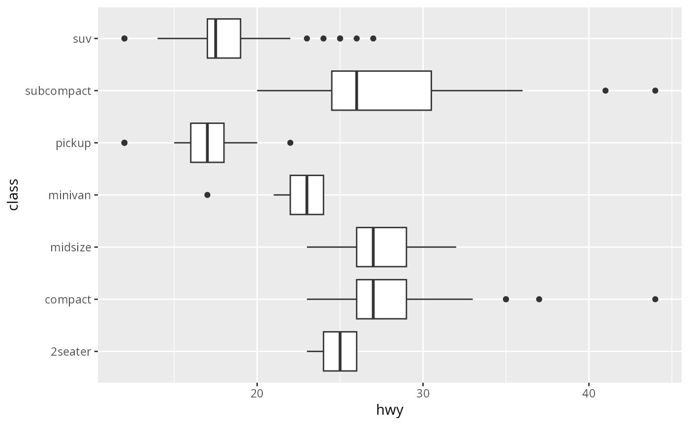 ggplot(mpg, aes(hwy, class)) + geom_boxplot()