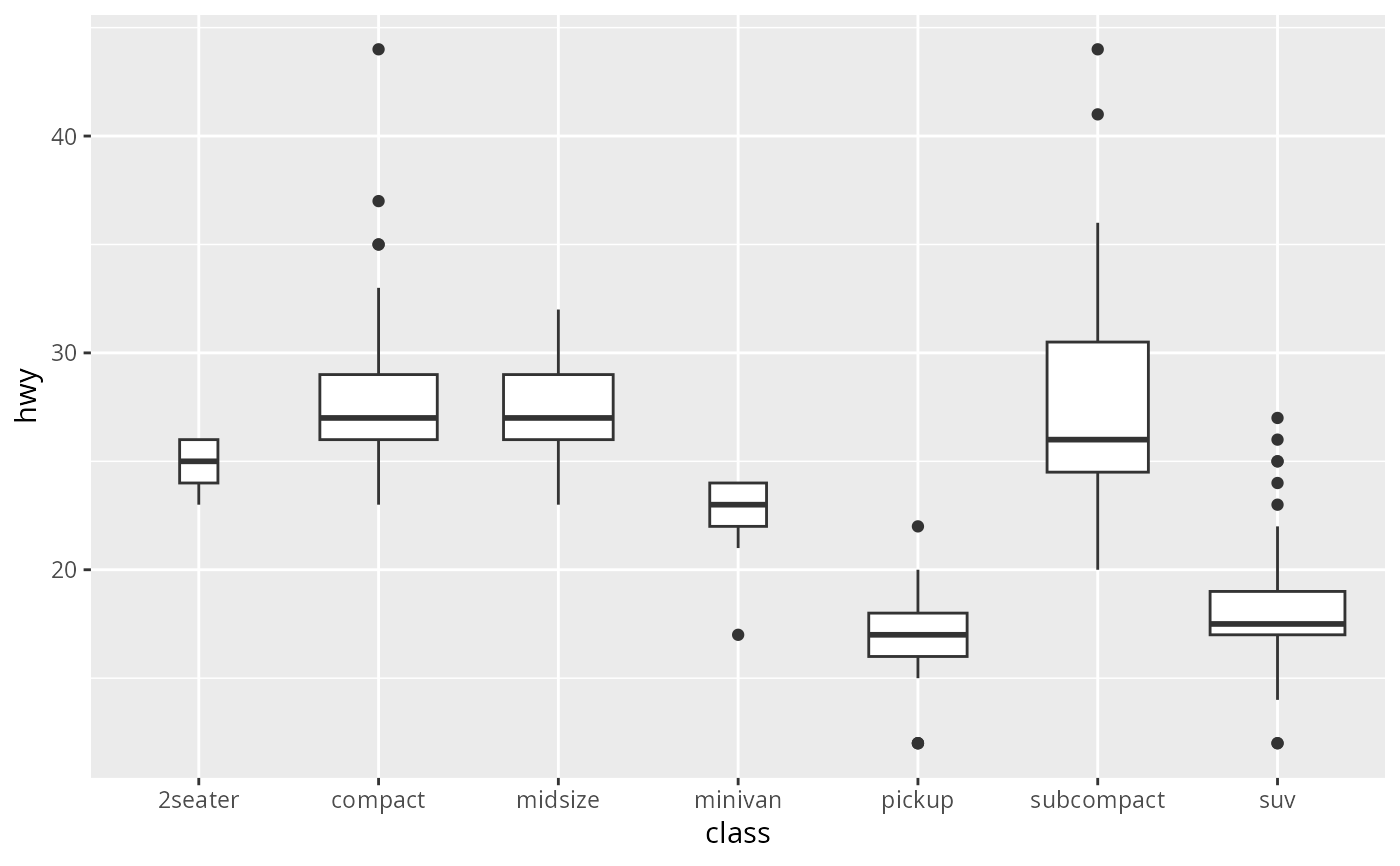 p <- ggplot(mpg, aes(class, hwy))