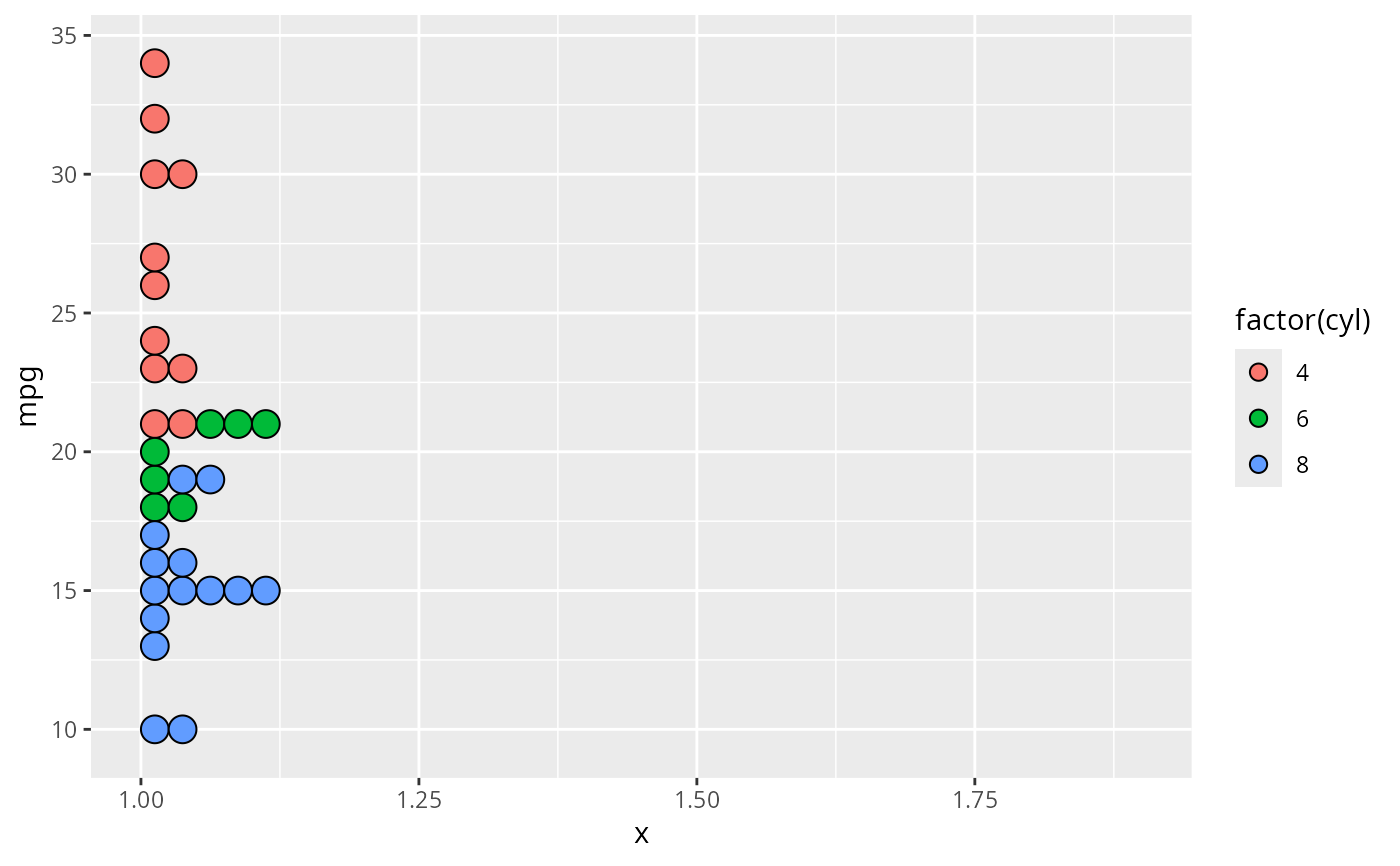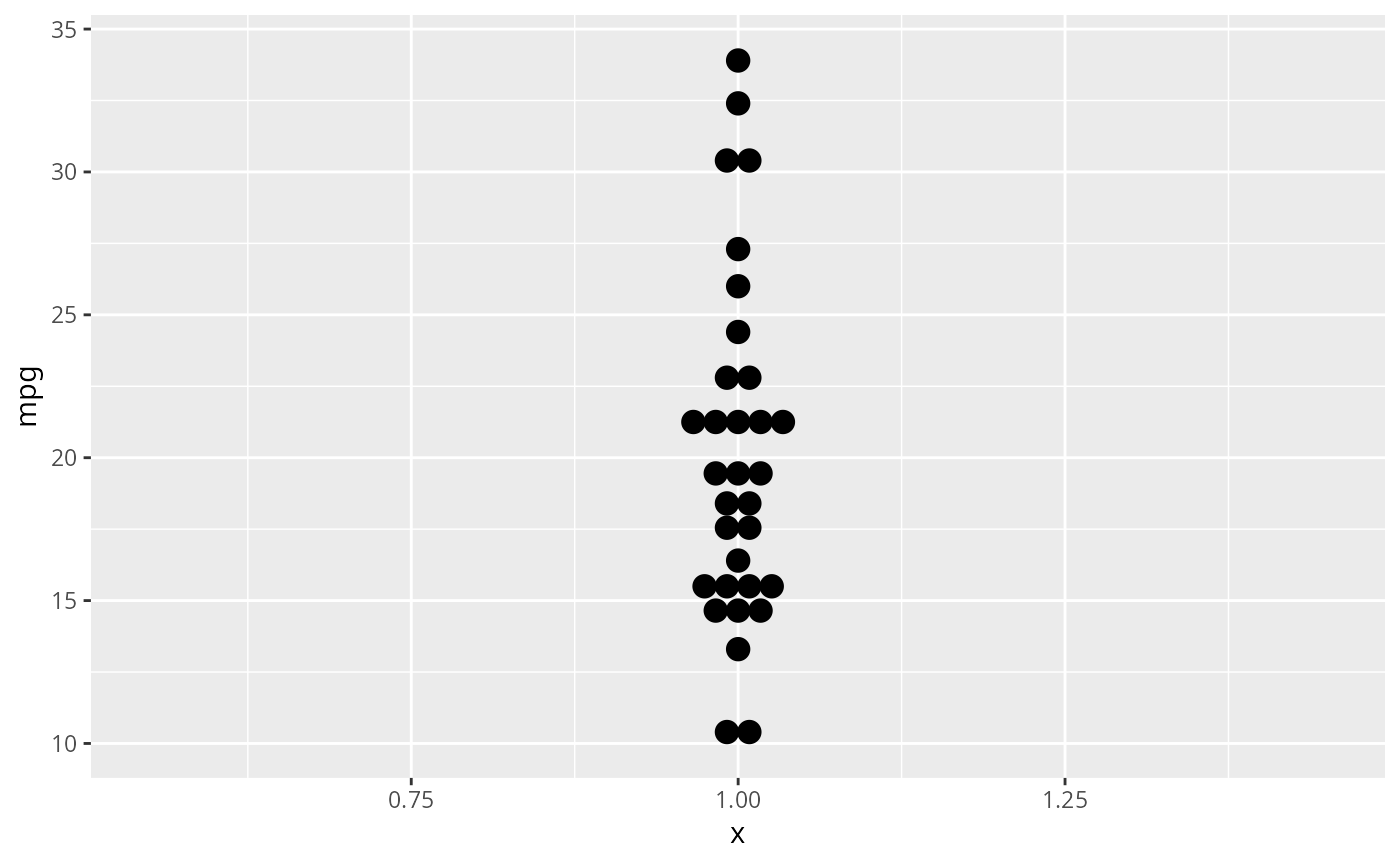 ggplot(mtcars, aes(x = 1, y = mpg)) +