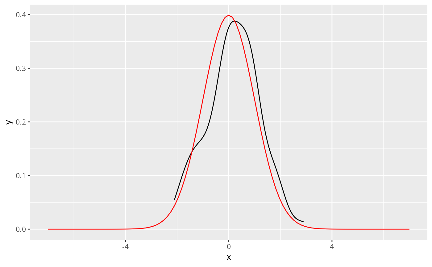 geom_function(fun = dnorm, colour = "red", xlim=c(-7, 7))