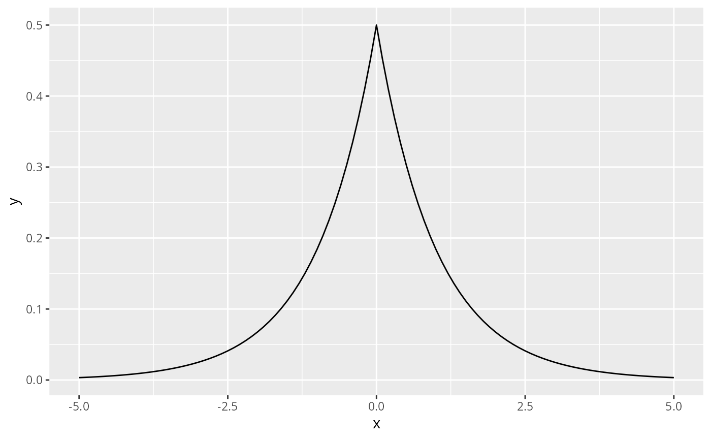 base + geom_function(fun = \(x) 0.5 * exp(-abs(x)))