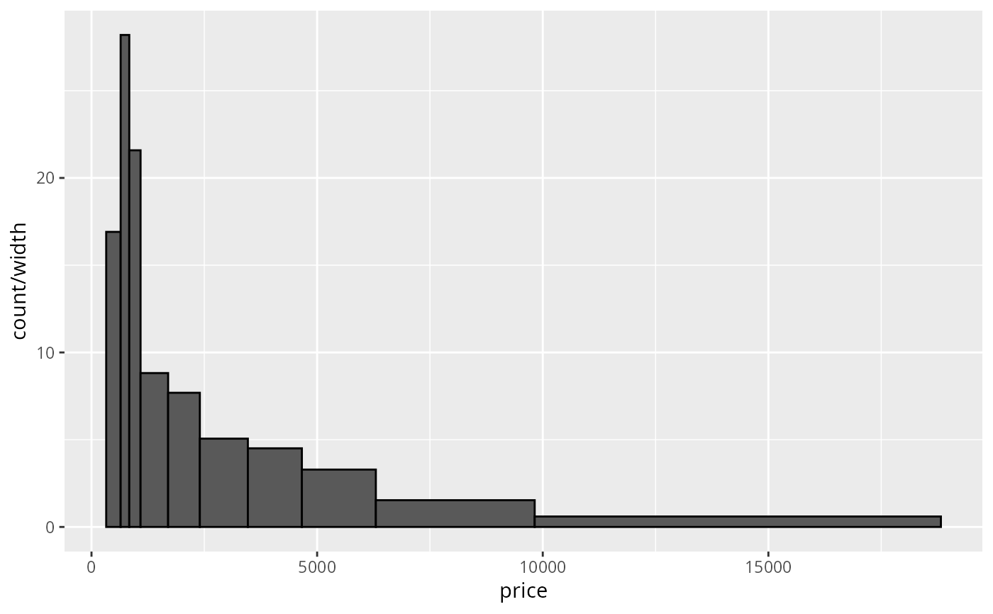 geom_histogram(breaks = price_bins, color = "black") # area = count