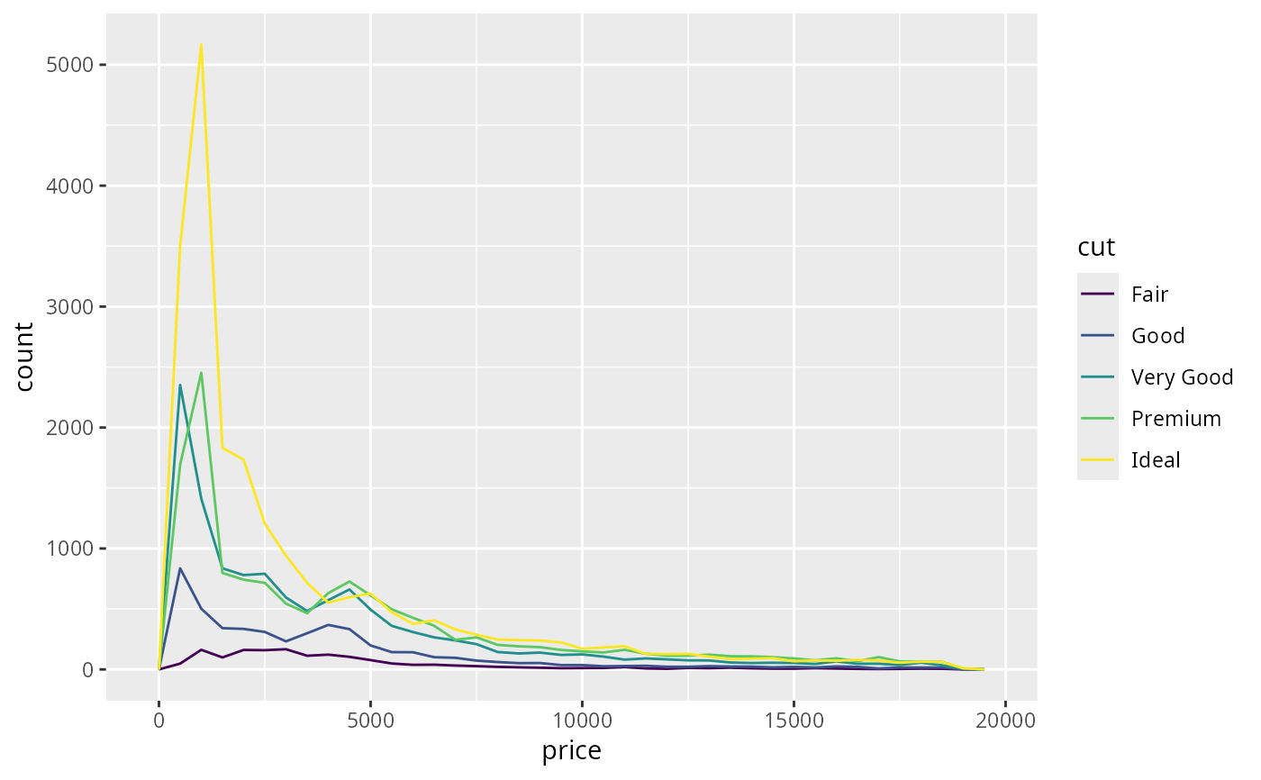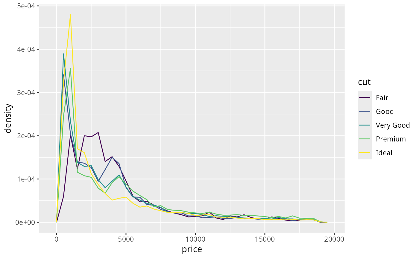 ggplot(diamonds, aes(price, after_stat(density), colour = cut)) +