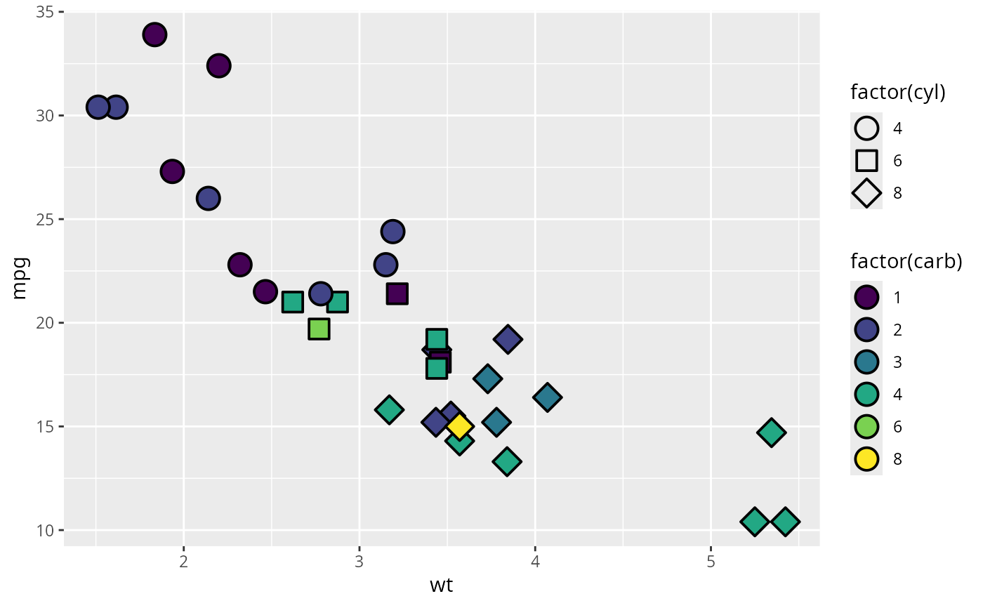 ggplot(mtcars, aes(wt, mpg, fill = factor(carb), shape = factor(cyl))) +