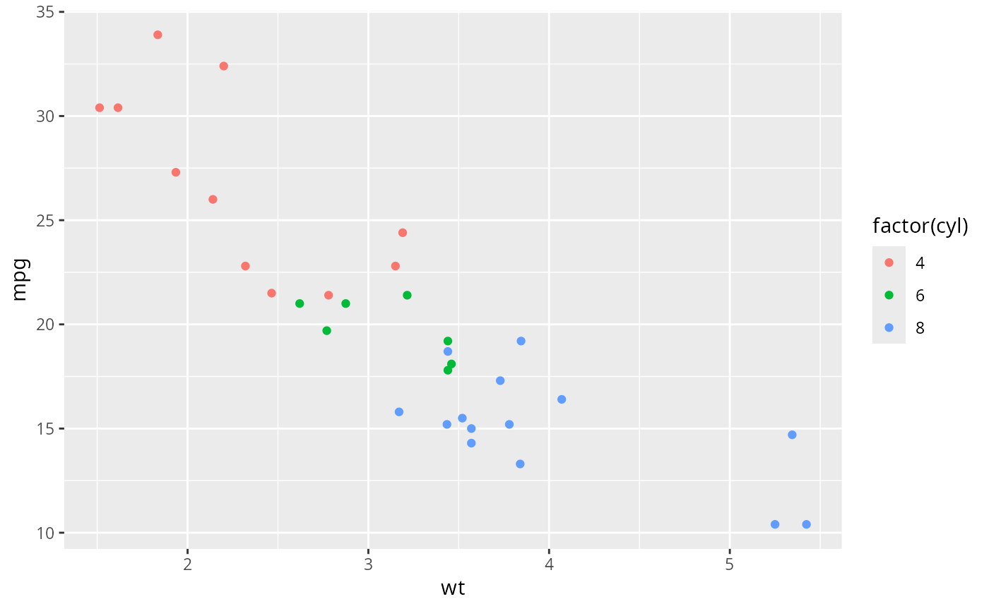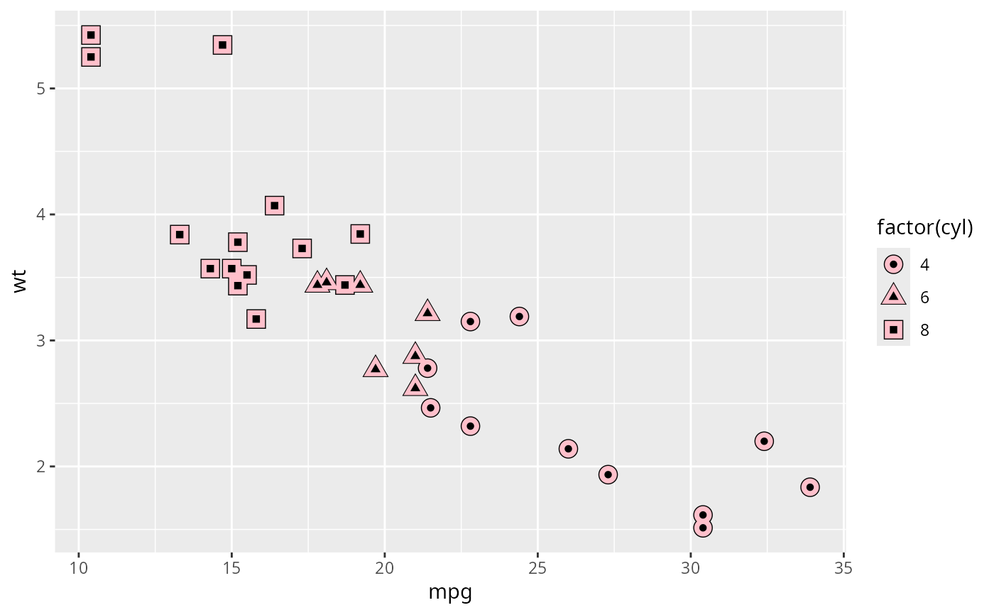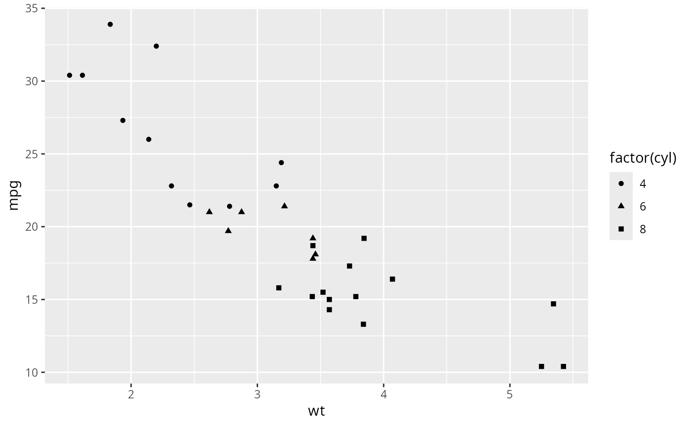 p <- ggplot(mtcars, aes(mpg, wt, shape = factor(cyl)))