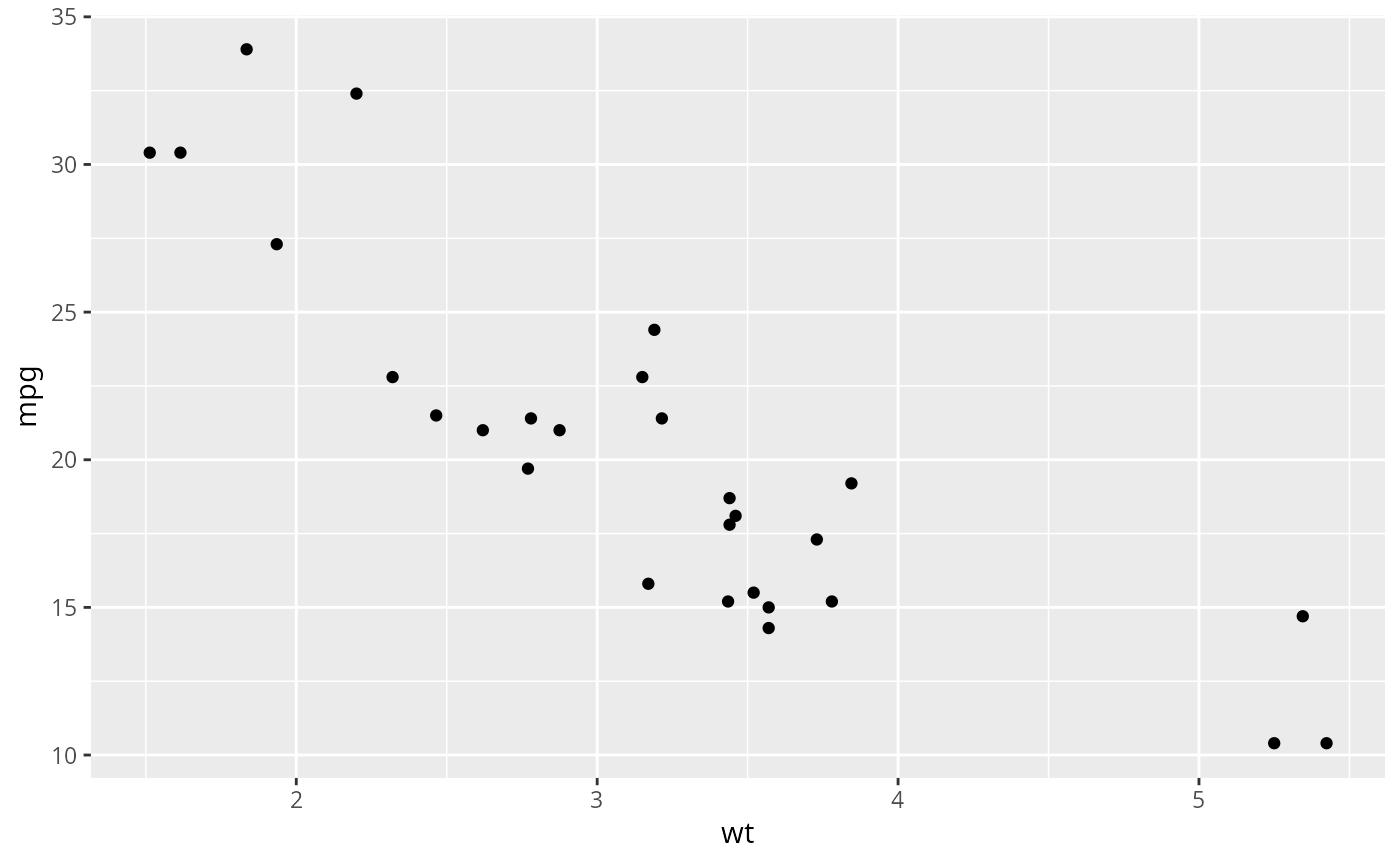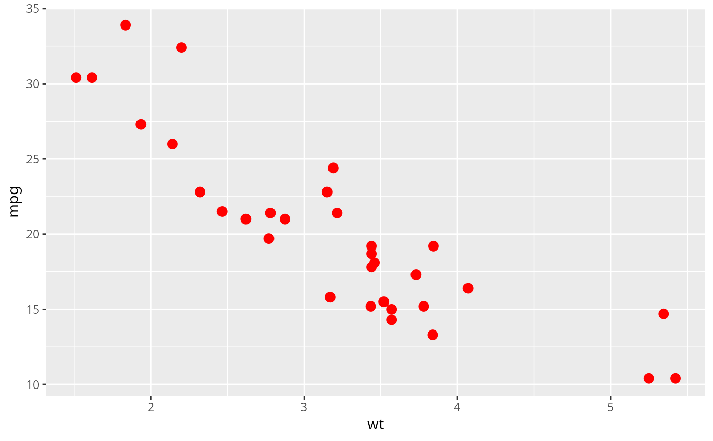 ggplot(mtcars, aes(wt, mpg)) + geom_point(colour = "red", size = 3)