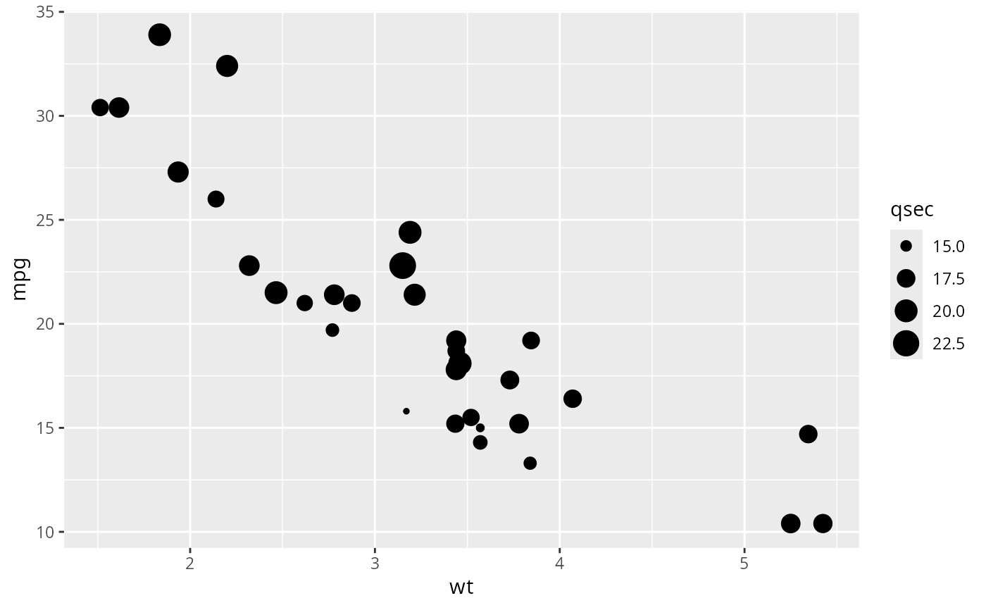 geom_point() understands the following aesthetics. Required aesthetics are displayed in bold and defaults are displayed for optional aesthetics: