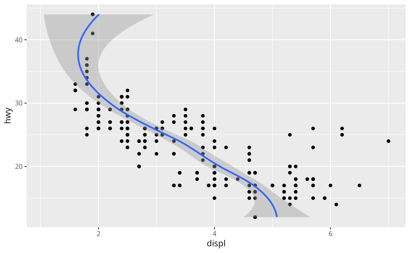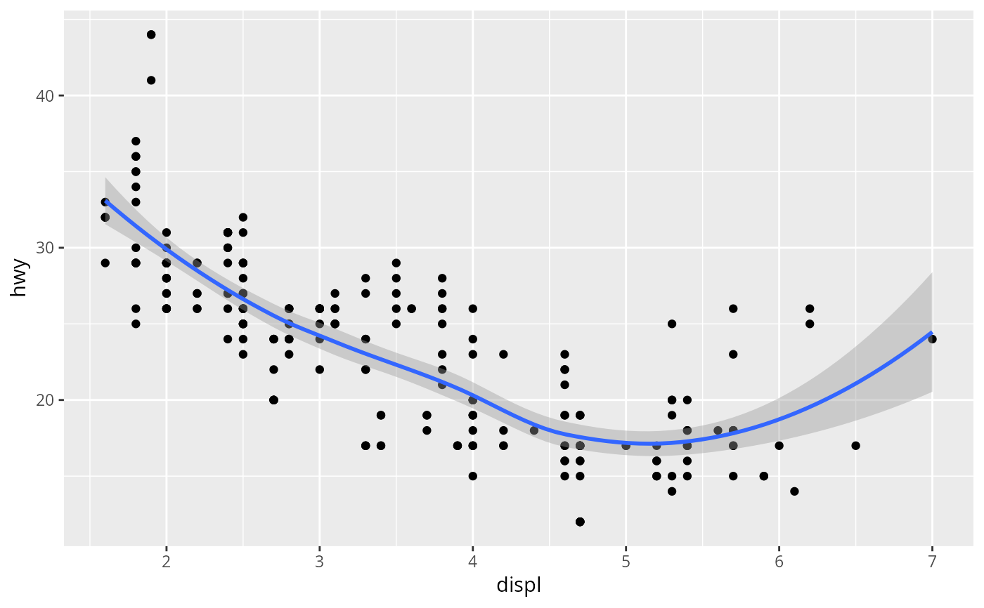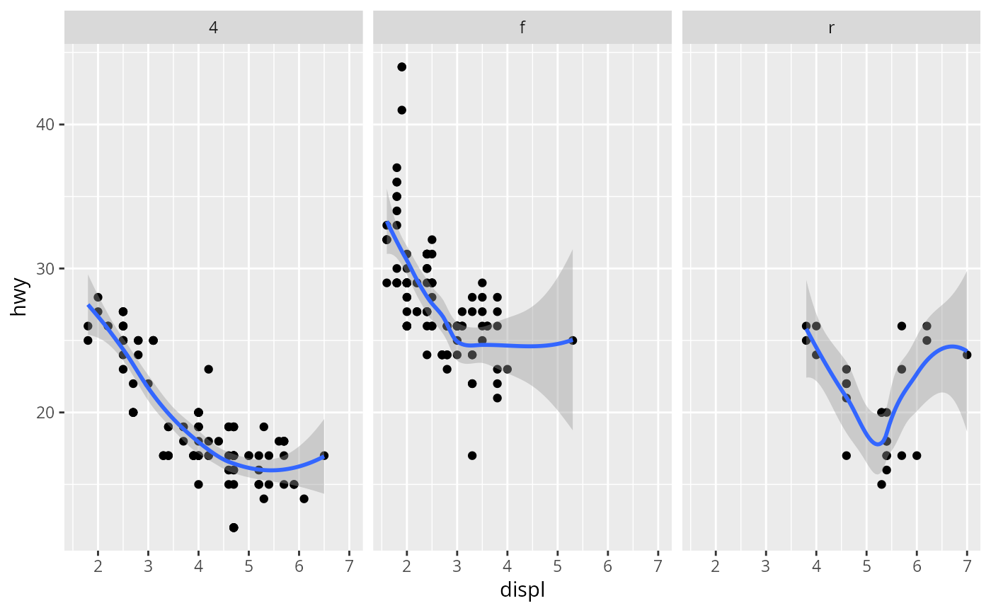 method = NULLthe smoothing method is chosen based on the size of the largest group (across all panels).stats::loess()is used for less than 1,000 observations; otherwisemgcv::gam()is used withformula = y ~ s(x, bs = "cs")withmethod = "REML". Somewhat anecdotally,loessgives a better appearance, but is \(O(N^{2})\) in memory, so does not work for larger datasets.If you have fewer than 1,000 observations but want to use the same